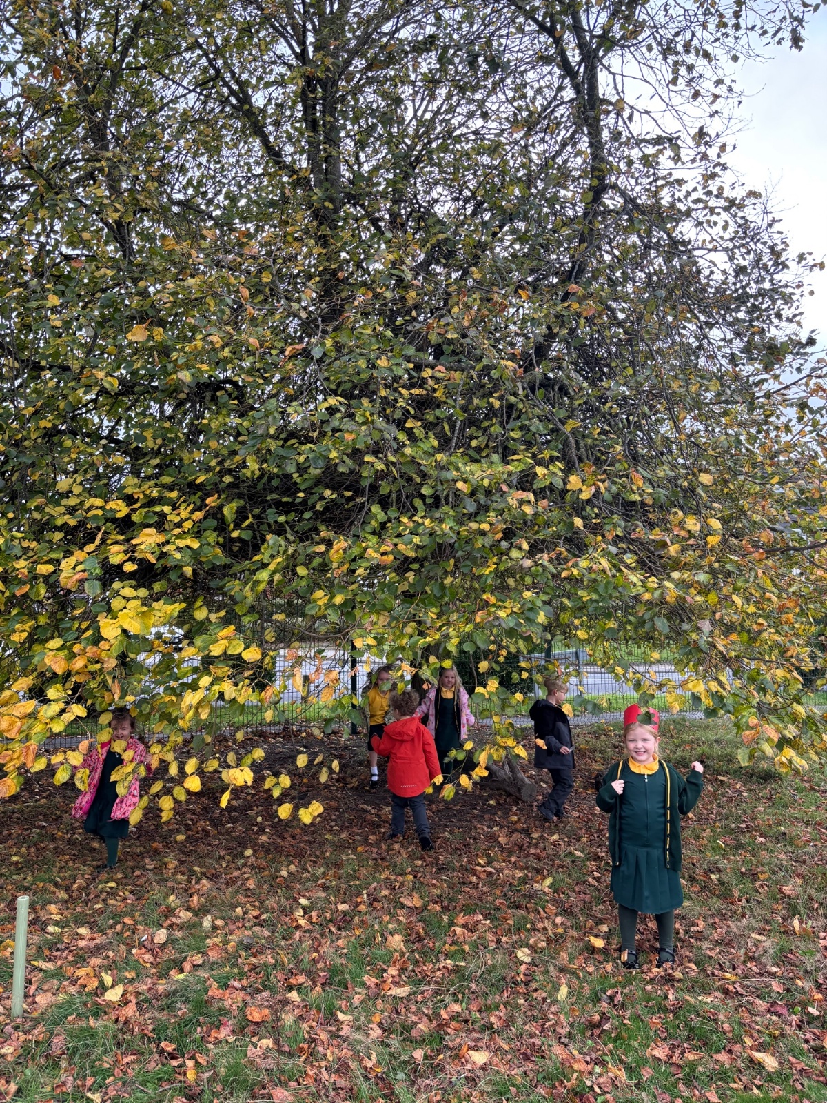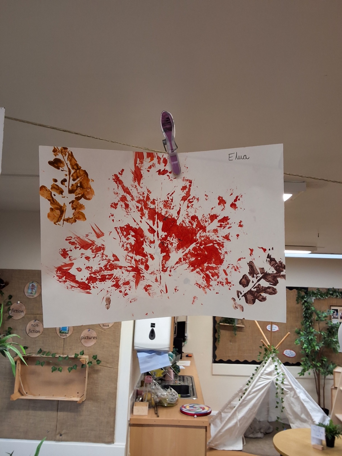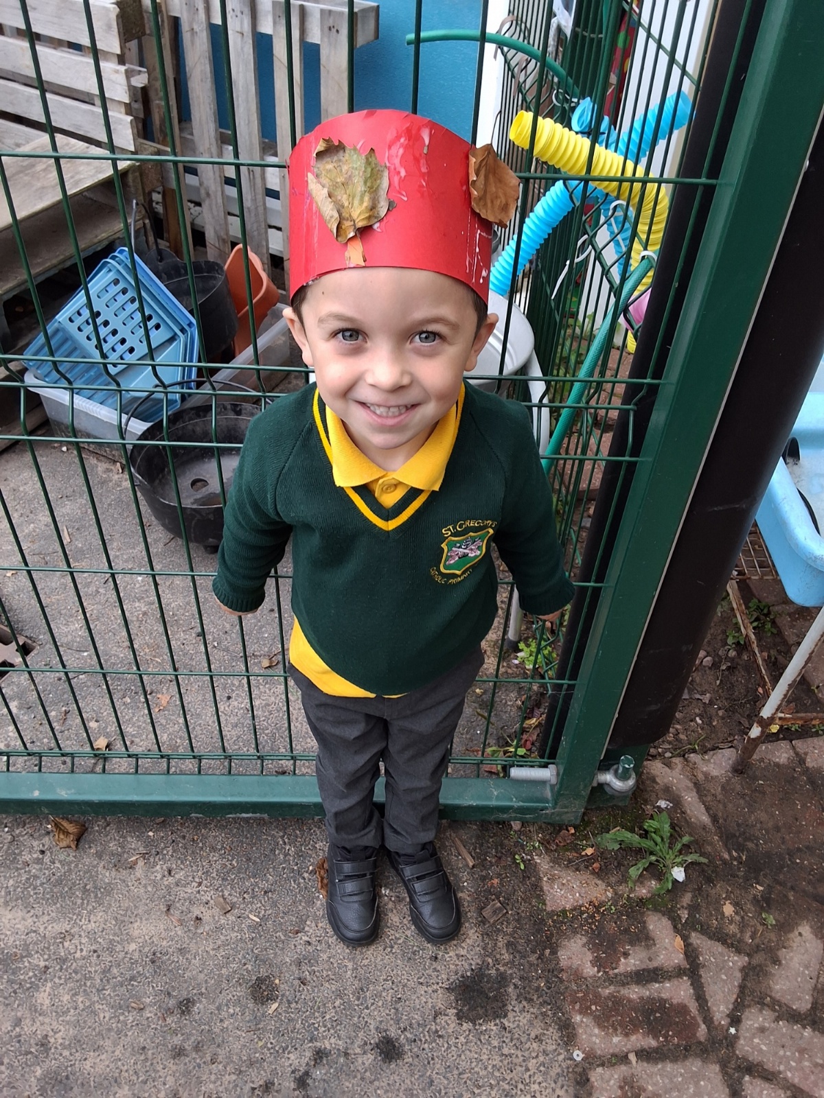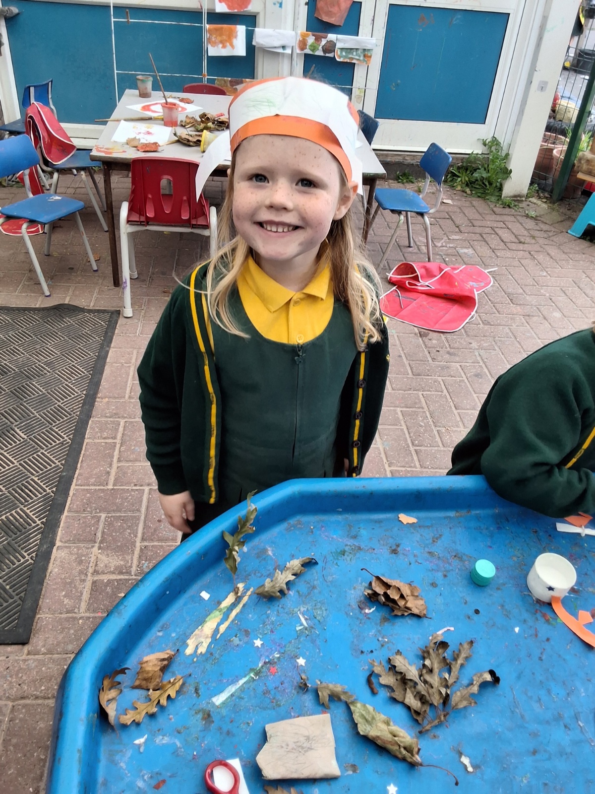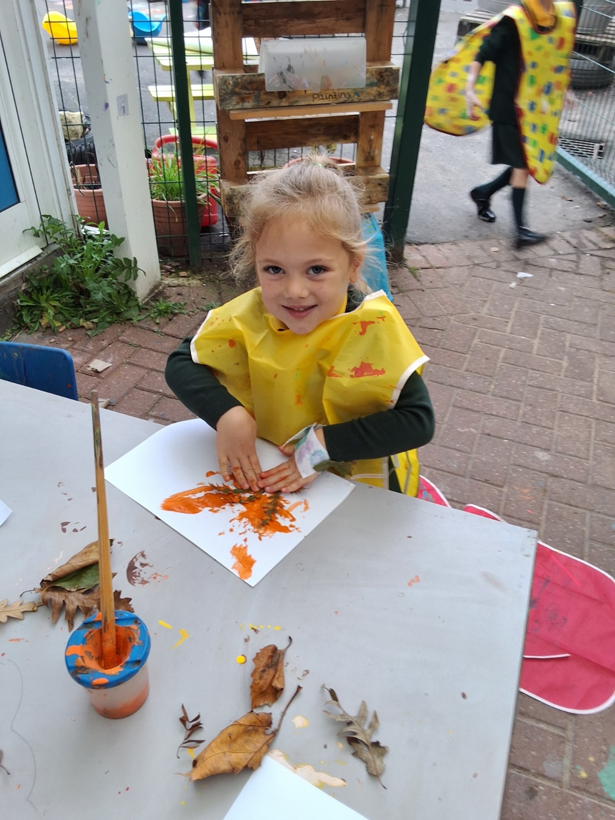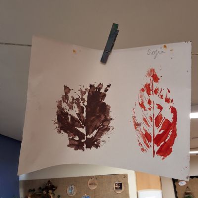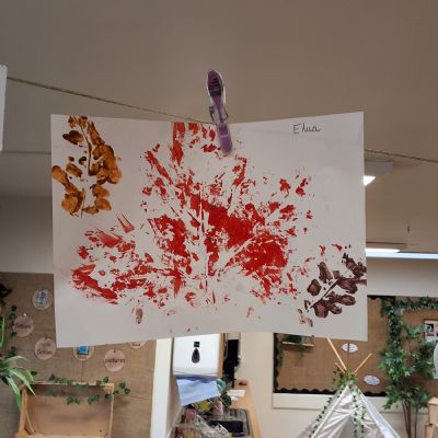 We watched a video called 'Automne' in Drawing Club this week. The character, Autumn, paints the world and creates autumn. We made autumn crowns, collected leaves to paint and make leaf rubbings, walked around school looking for signs of autumn, and we even found what we think is Autumn's home at the base of a tree!