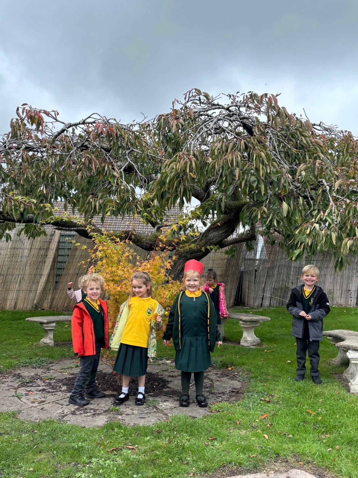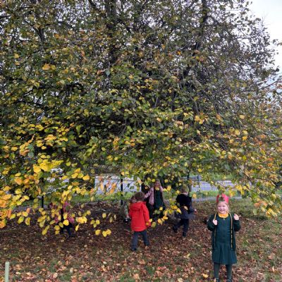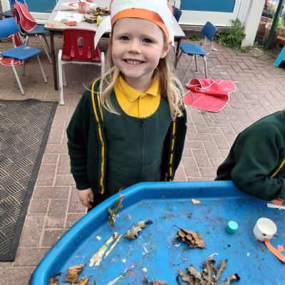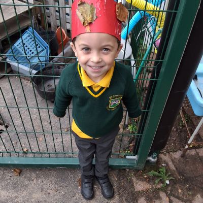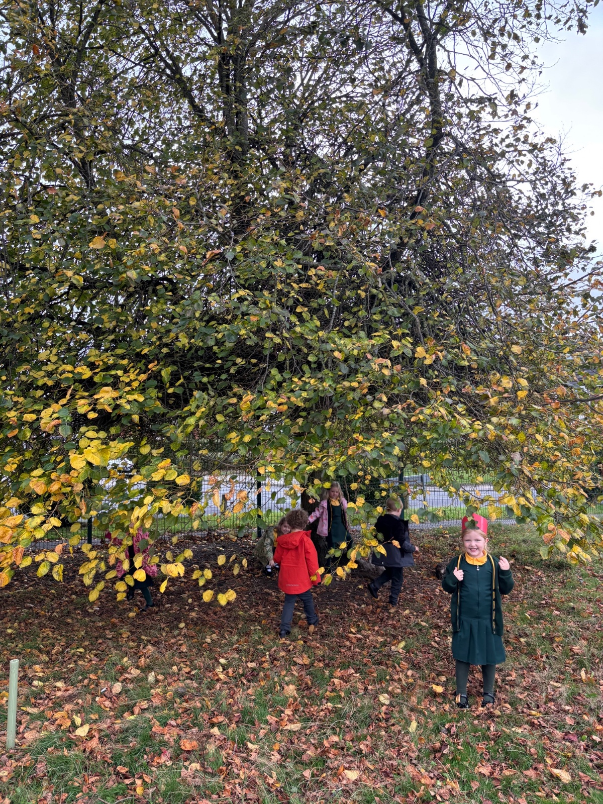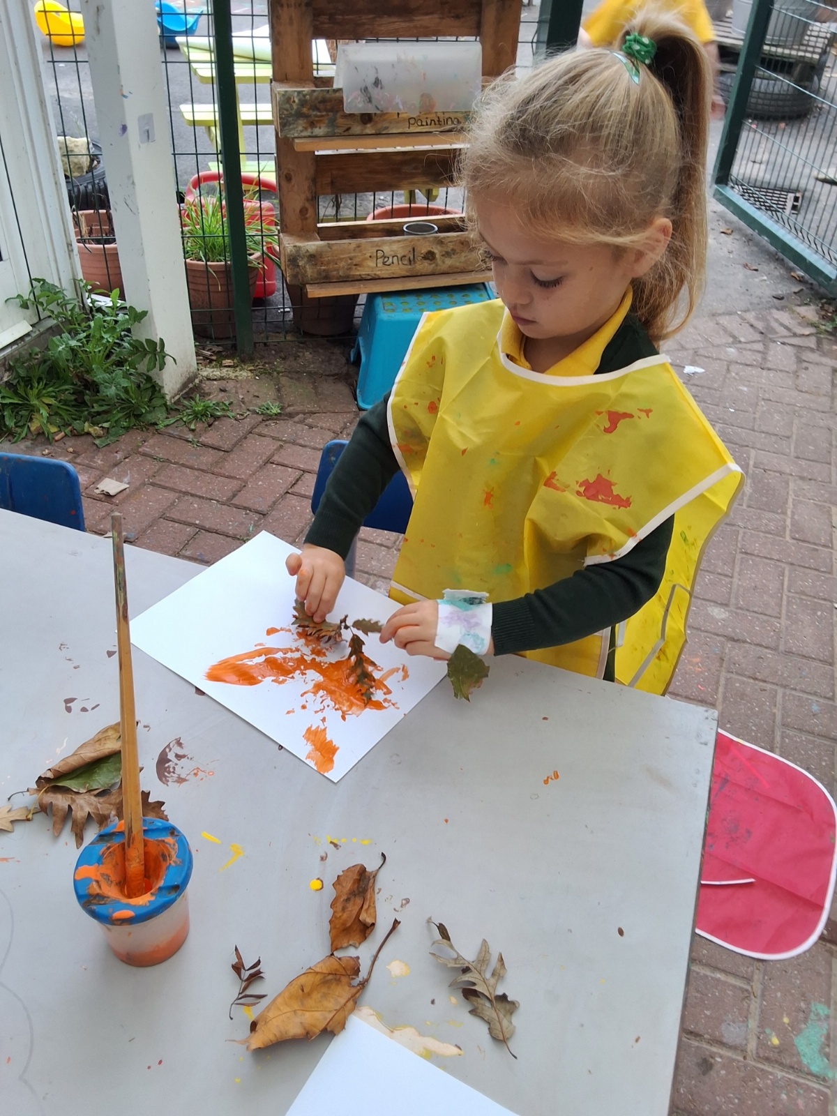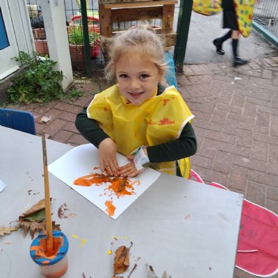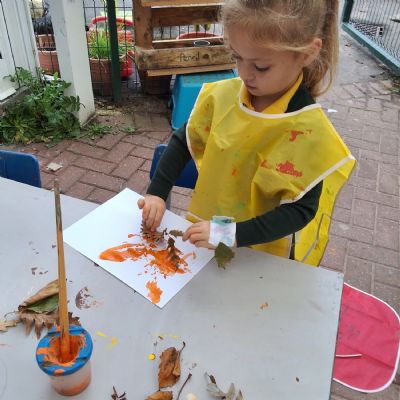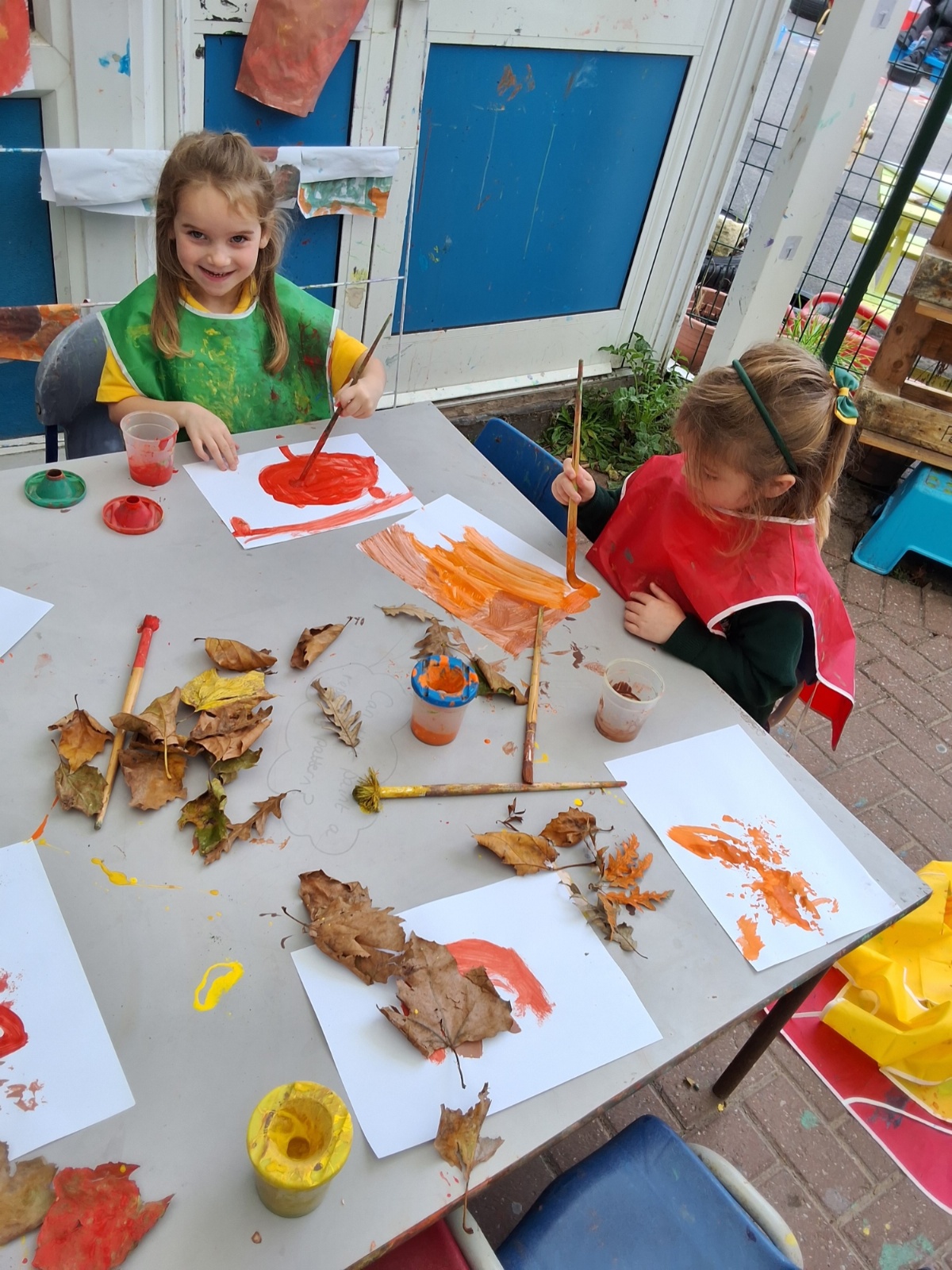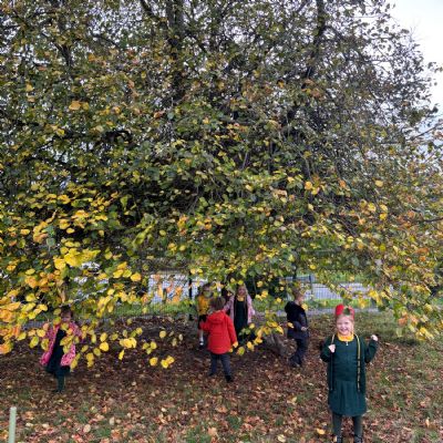 We watched a video called 'Automne' in Drawing Club this week. The character, Autumn, paints the world and creates autumn. We made autumn crowns, collected leaves to paint and make leaf rubbings, walked around school looking for signs of autumn, and we even found what we think is Autumn's home at the base of a tree!