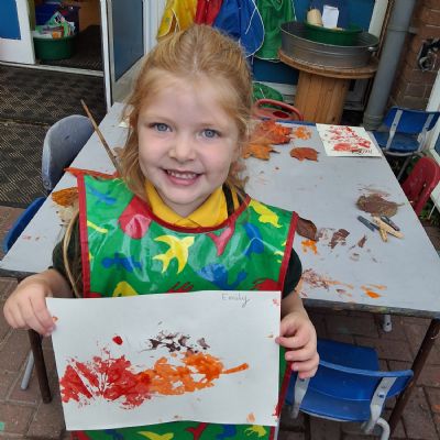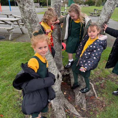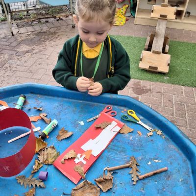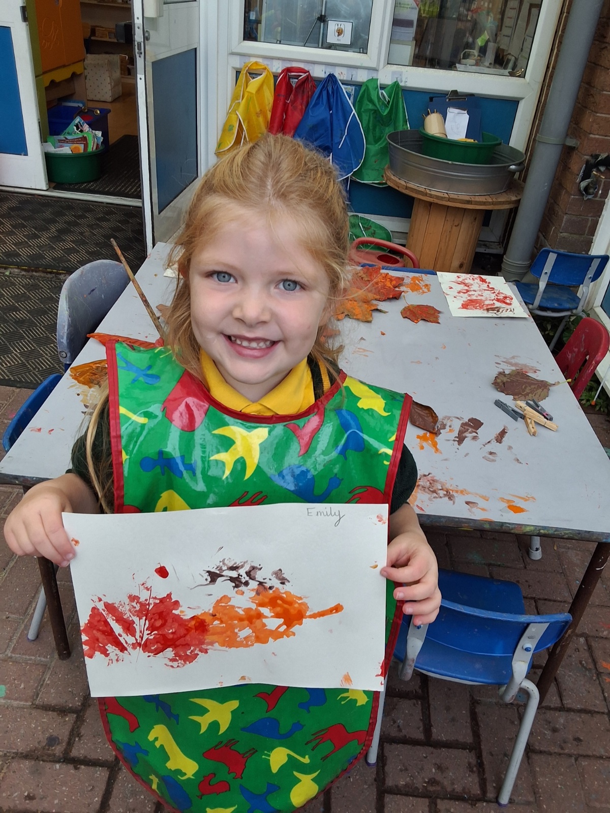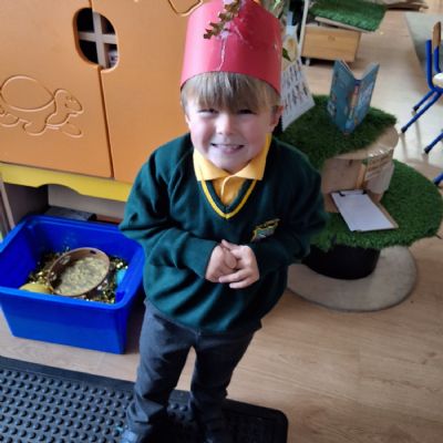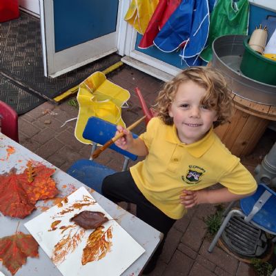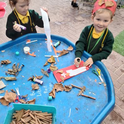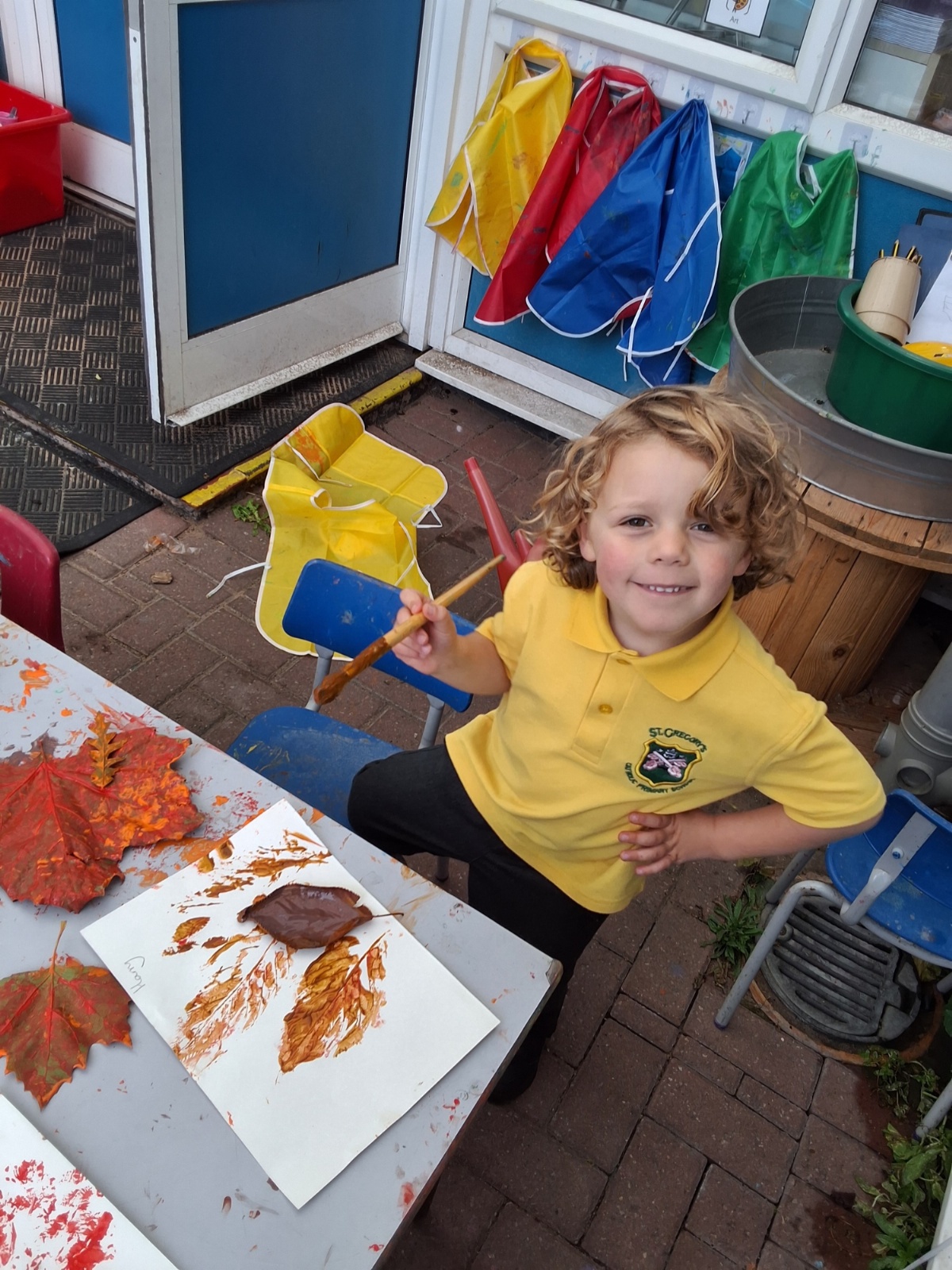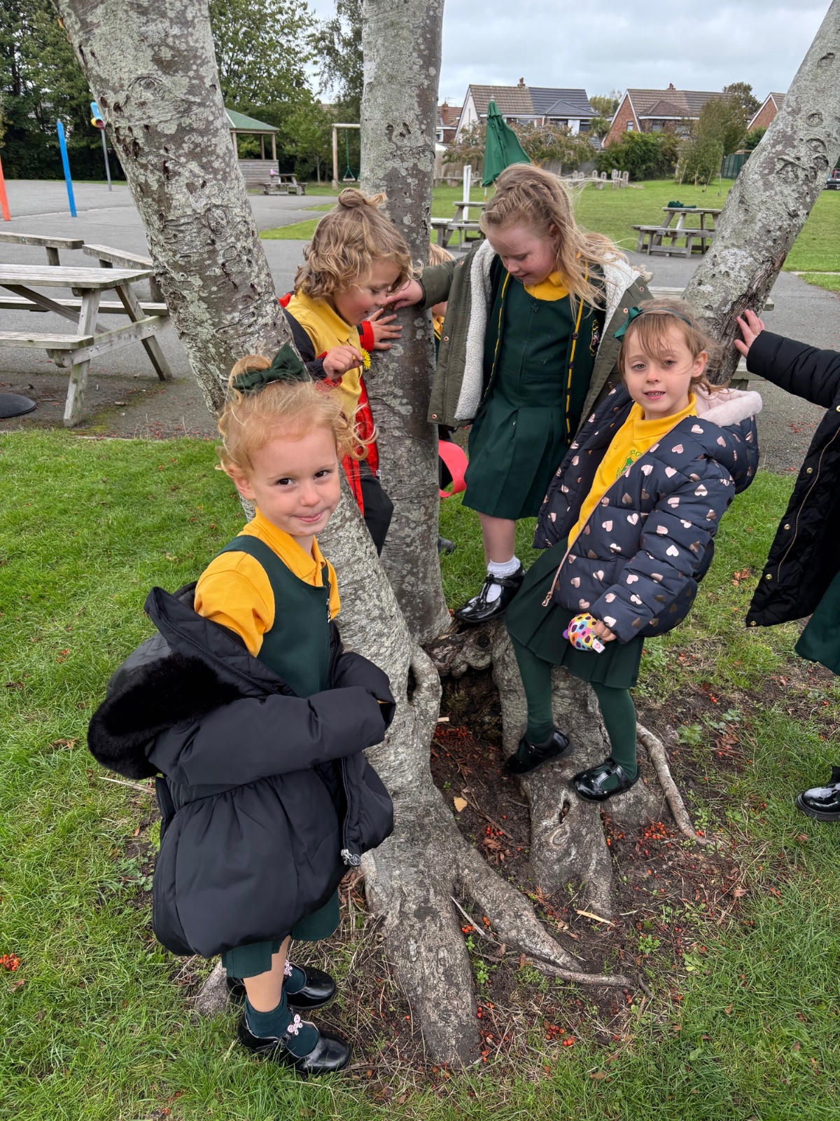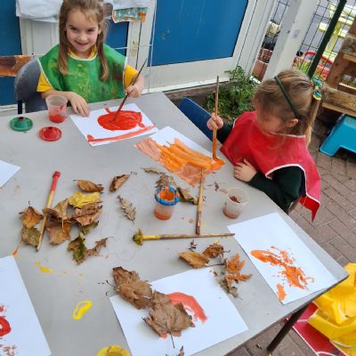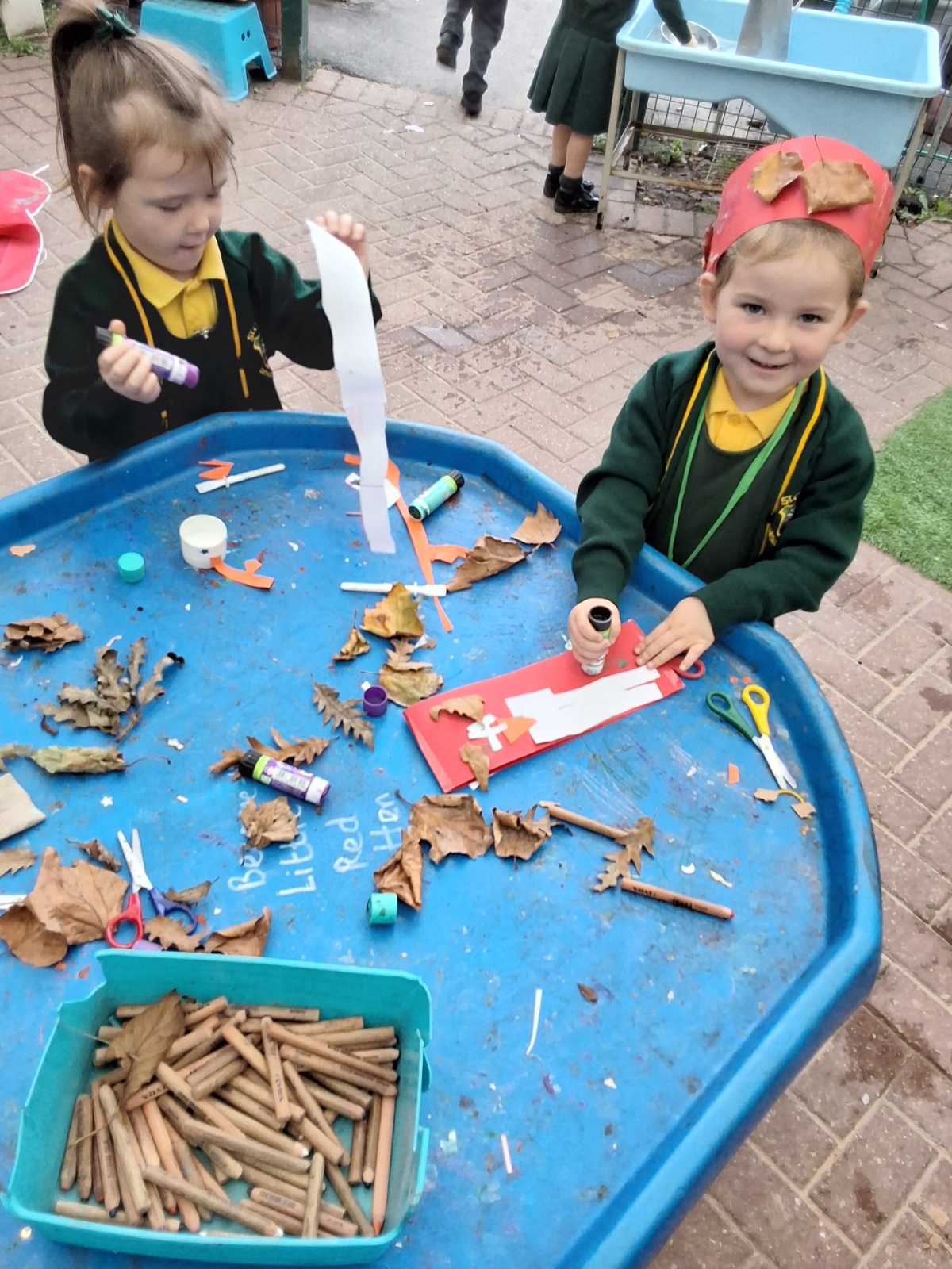 We watched a video called 'Automne' in Drawing Club this week. The character, Autumn, paints the world and creates autumn. We made autumn crowns, collected leaves to paint and make leaf rubbings, walked around school looking for signs of autumn, and we even found what we think is Autumn's home at the base of a tree!