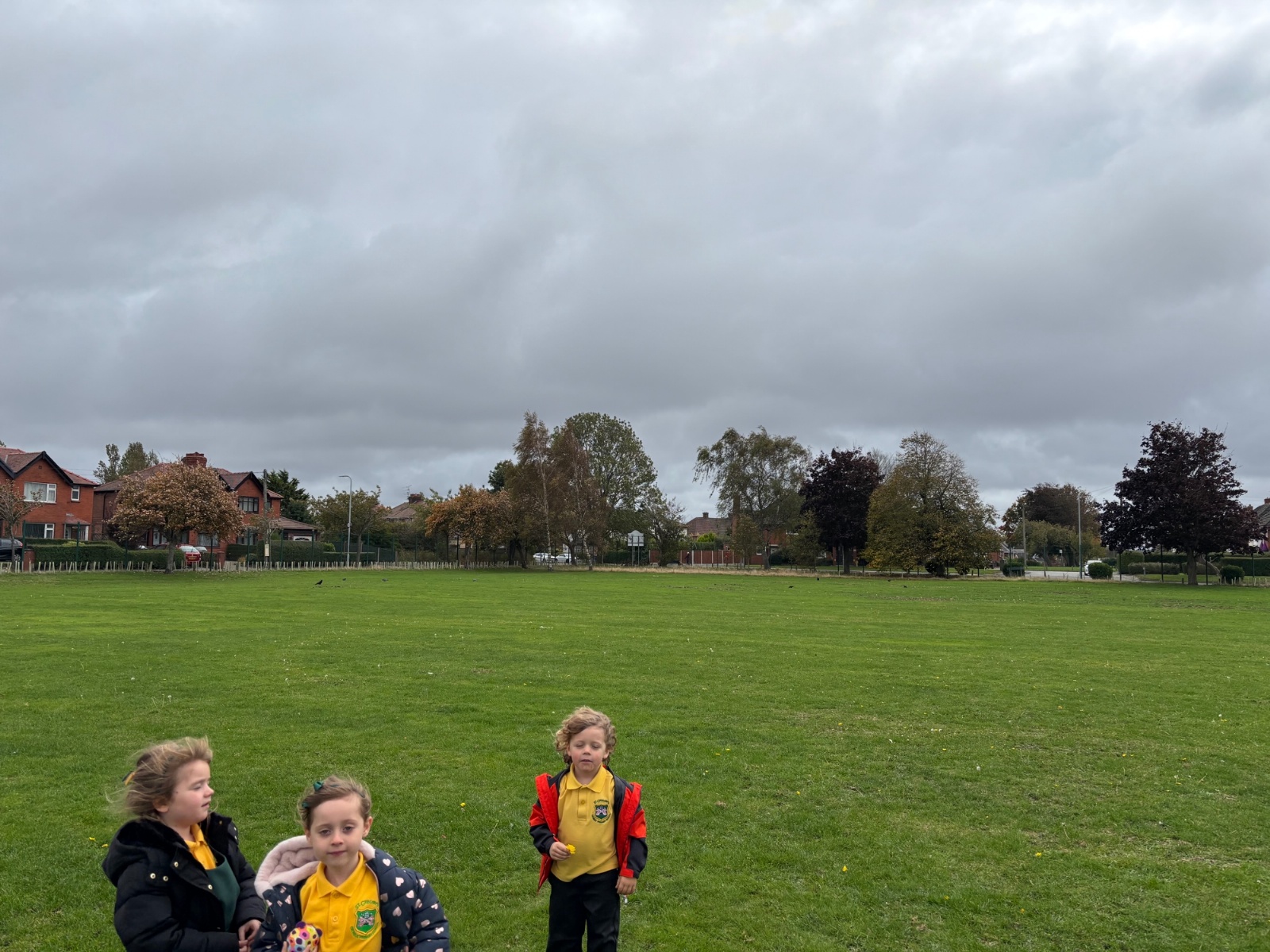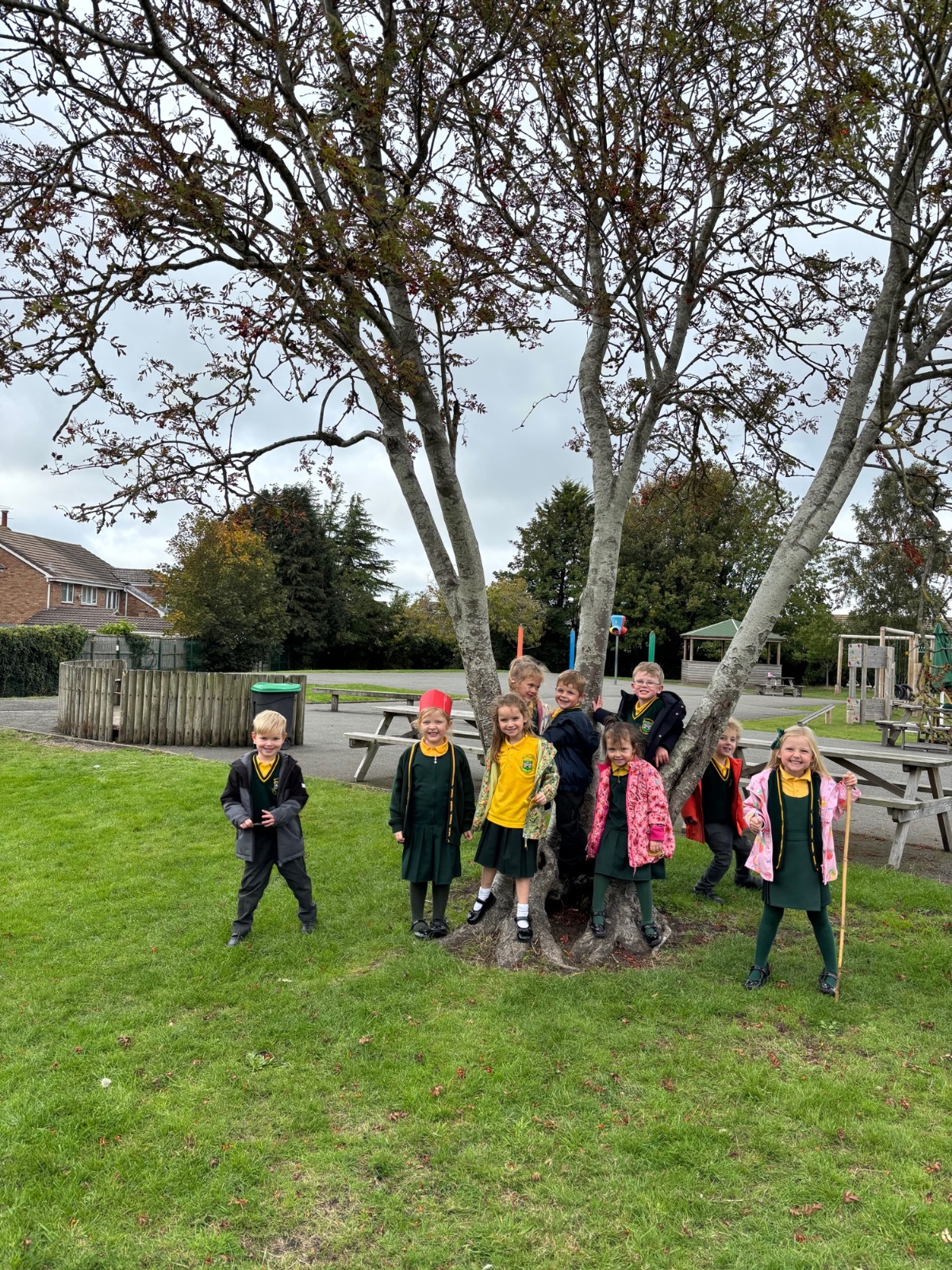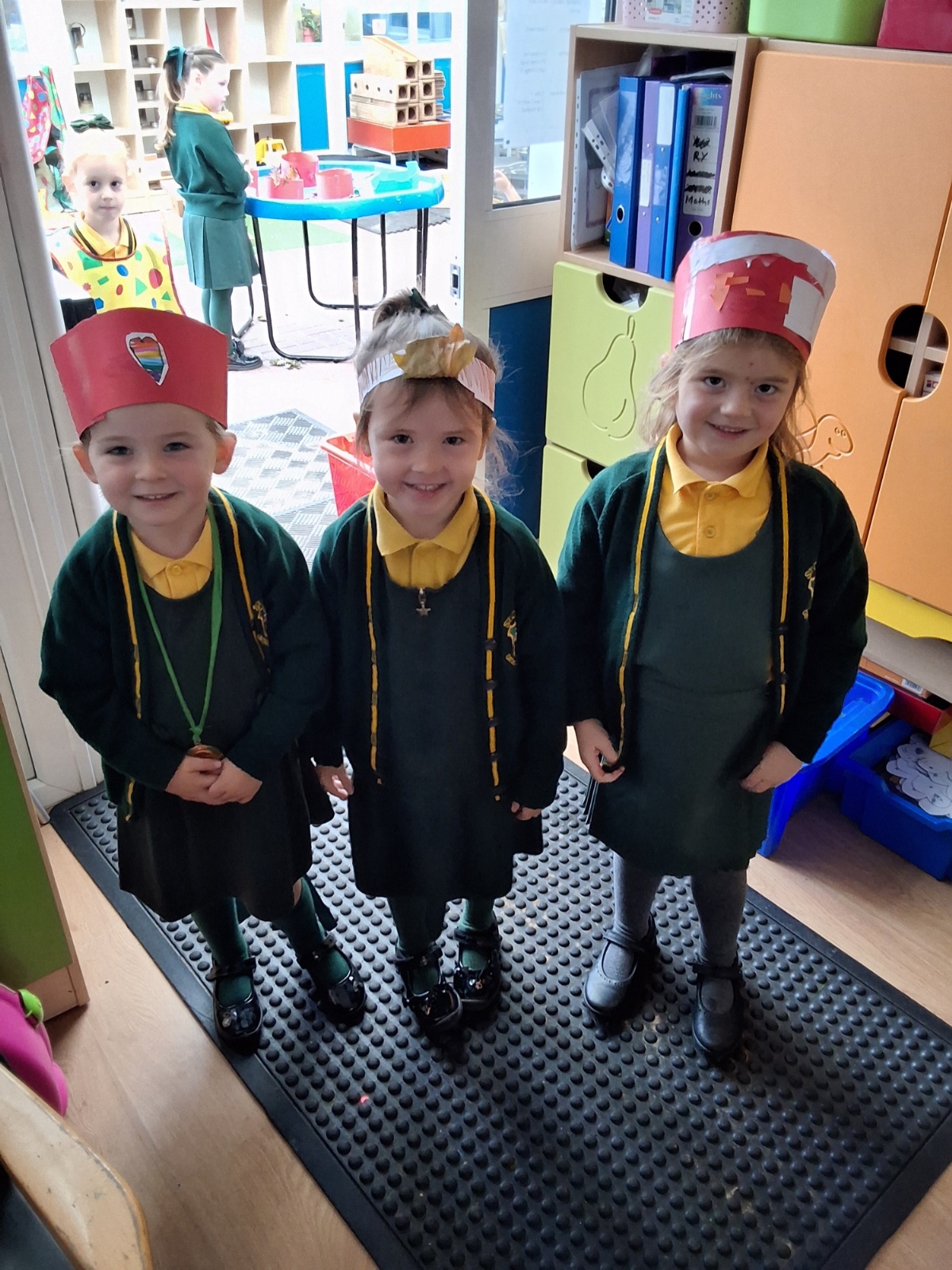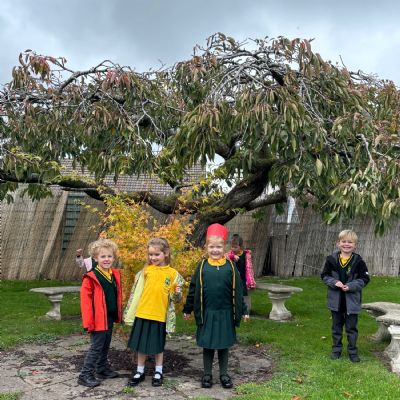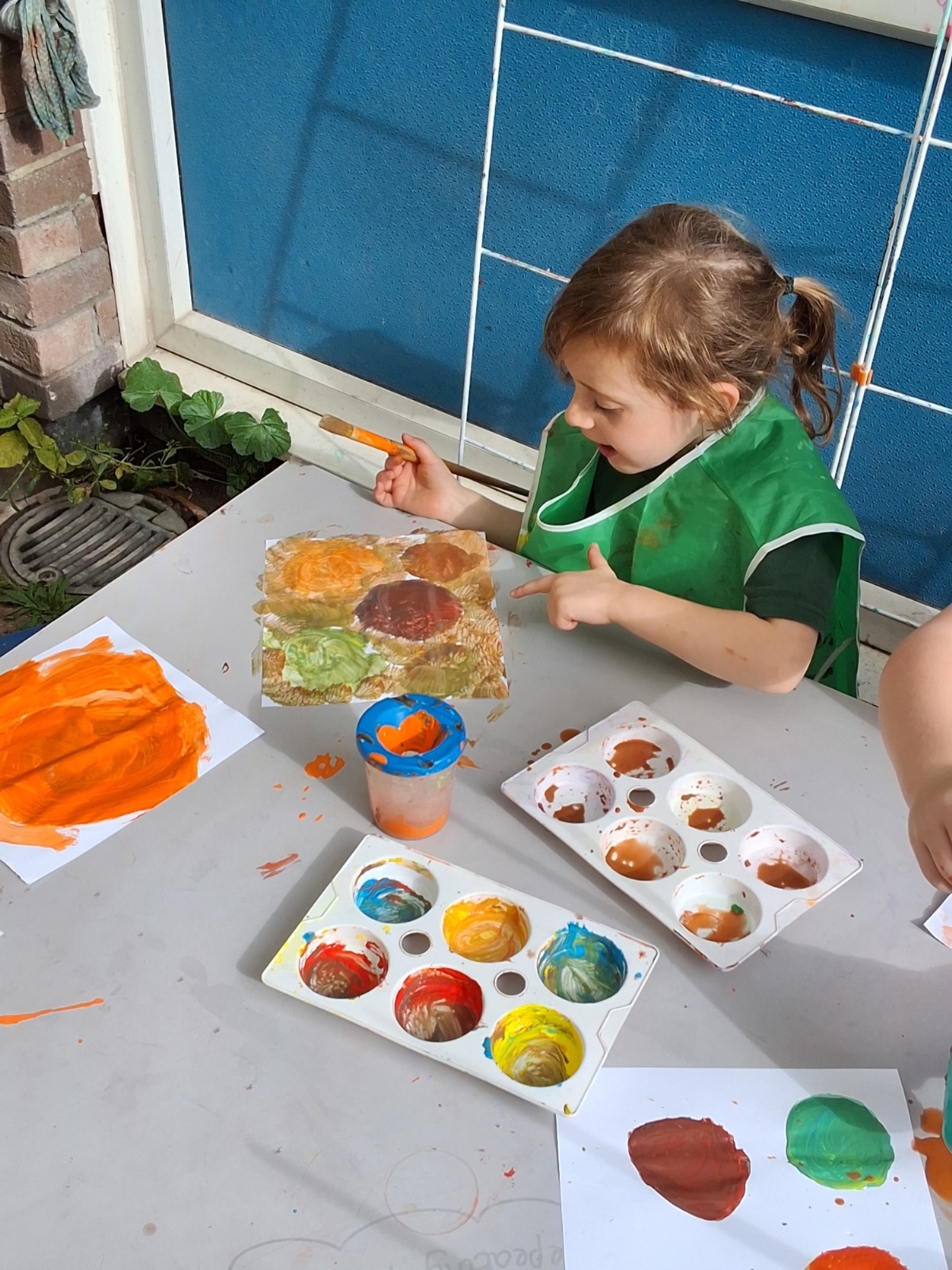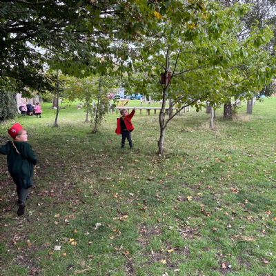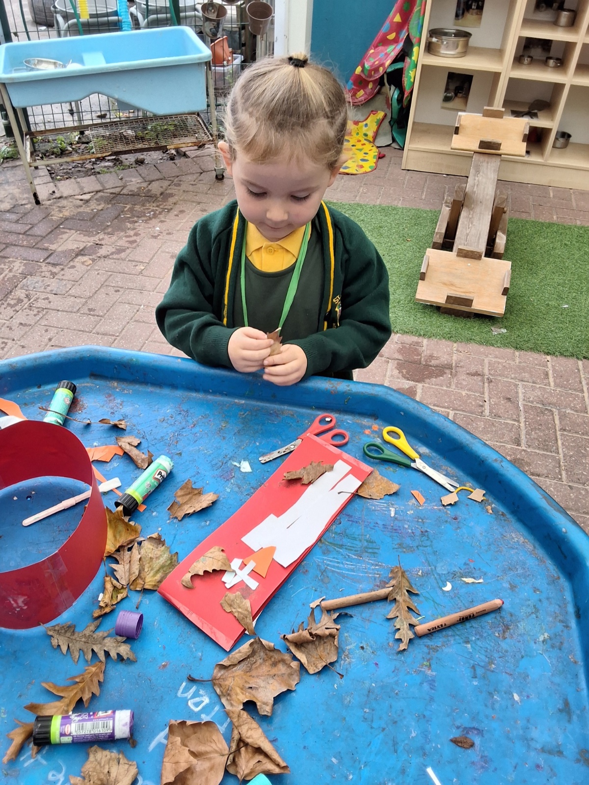 We watched a video called 'Automne' in Drawing Club this week. The character, Autumn, paints the world and creates autumn. We made autumn crowns, collected leaves to paint and make leaf rubbings, walked around school looking for signs of autumn, and we even found what we think is Autumn's home at the base of a tree!