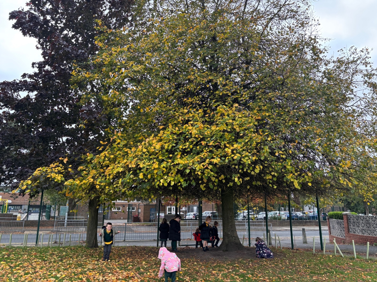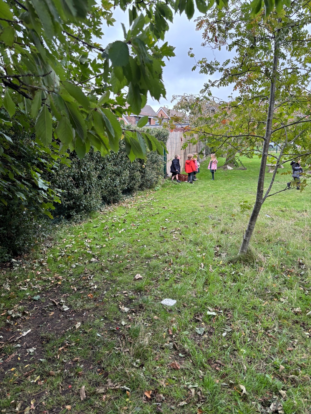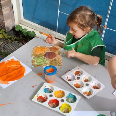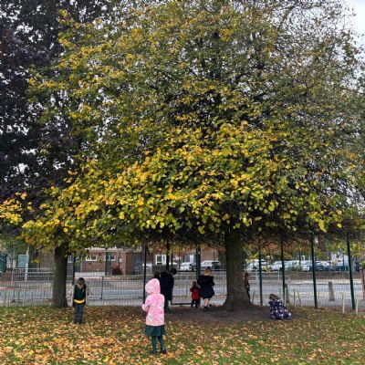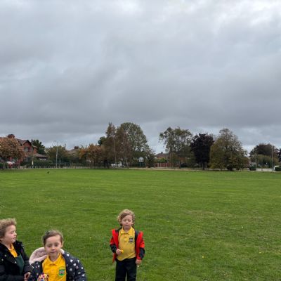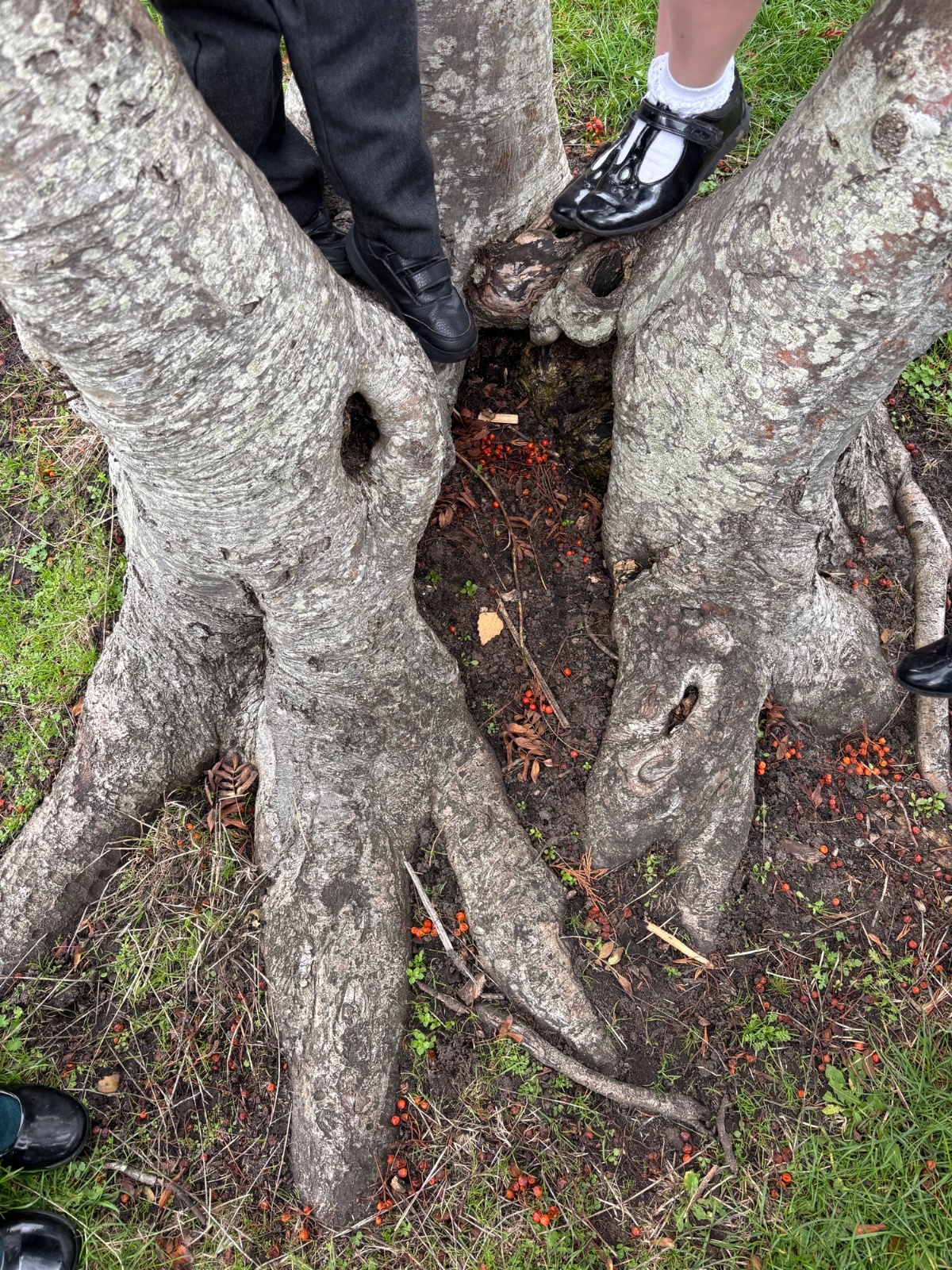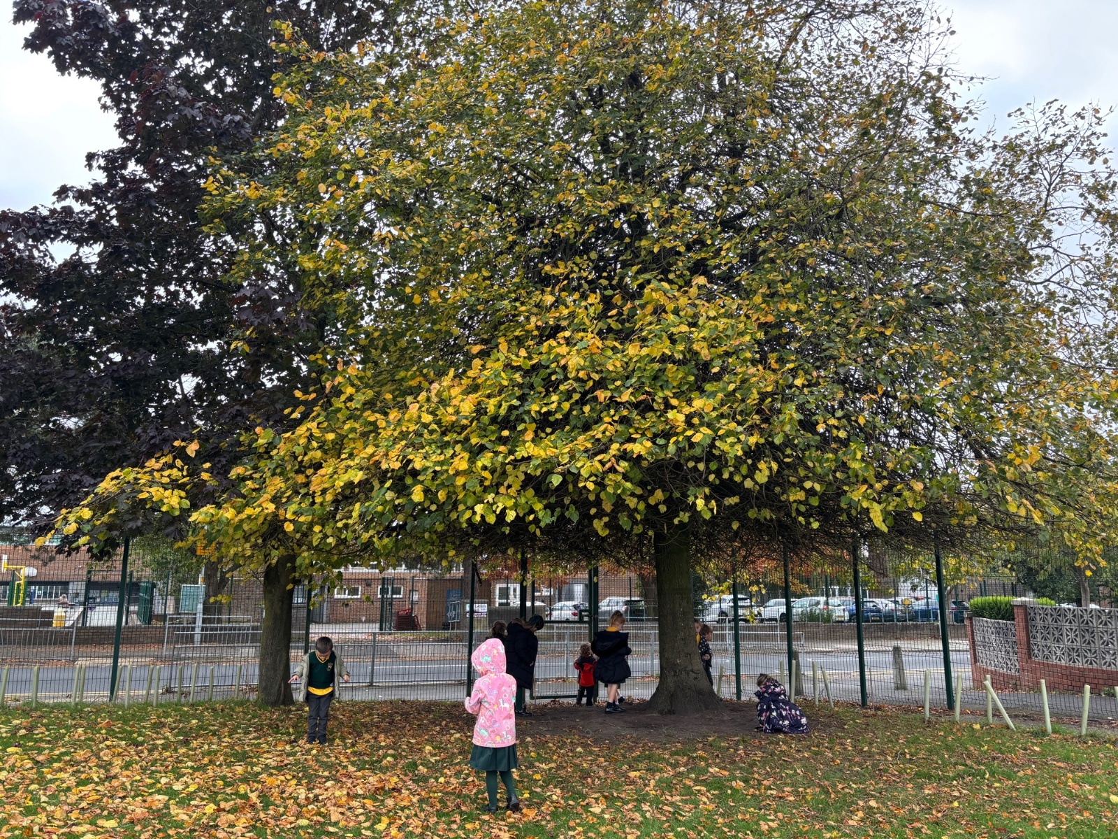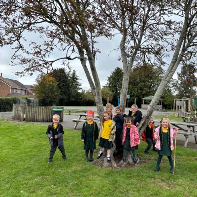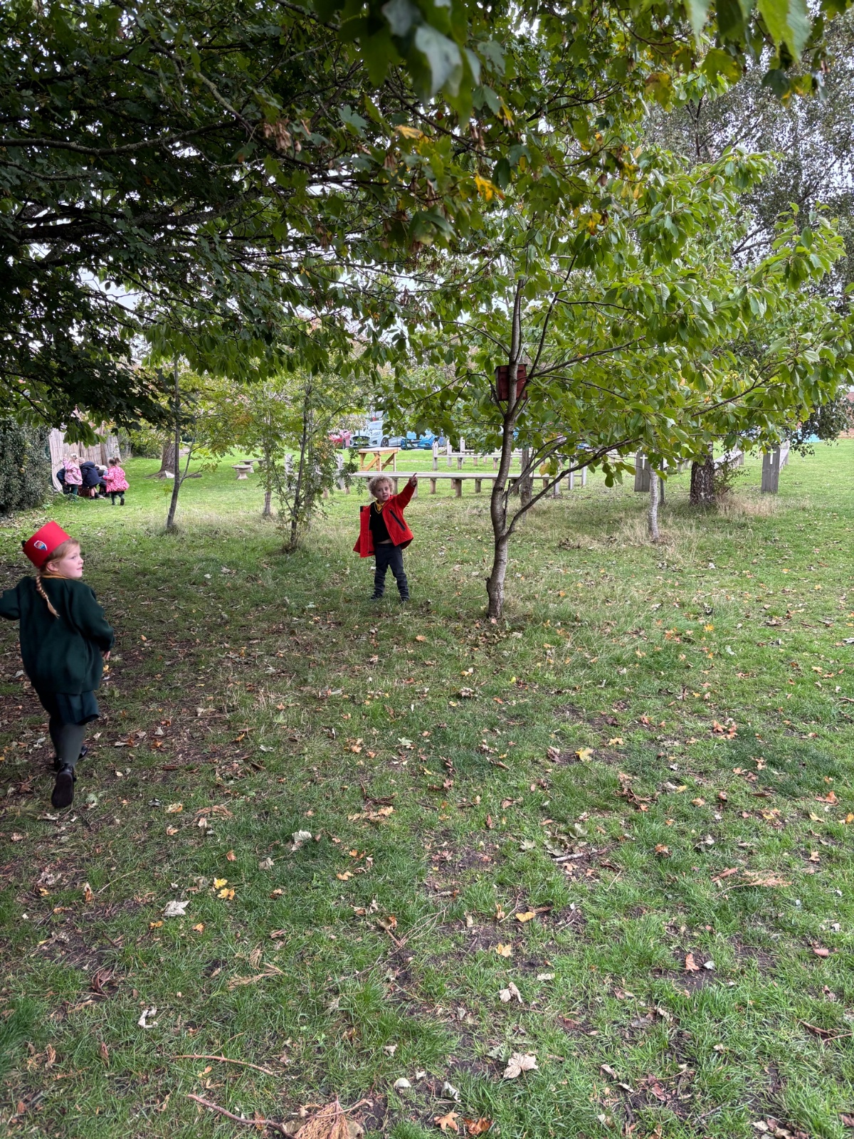 We watched a video called 'Automne' in Drawing Club this week. The character, Autumn, paints the world and creates autumn. We made autumn crowns, collected leaves to paint and make leaf rubbings, walked around school looking for signs of autumn, and we even found what we think is Autumn's home at the base of a tree!