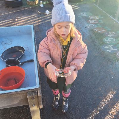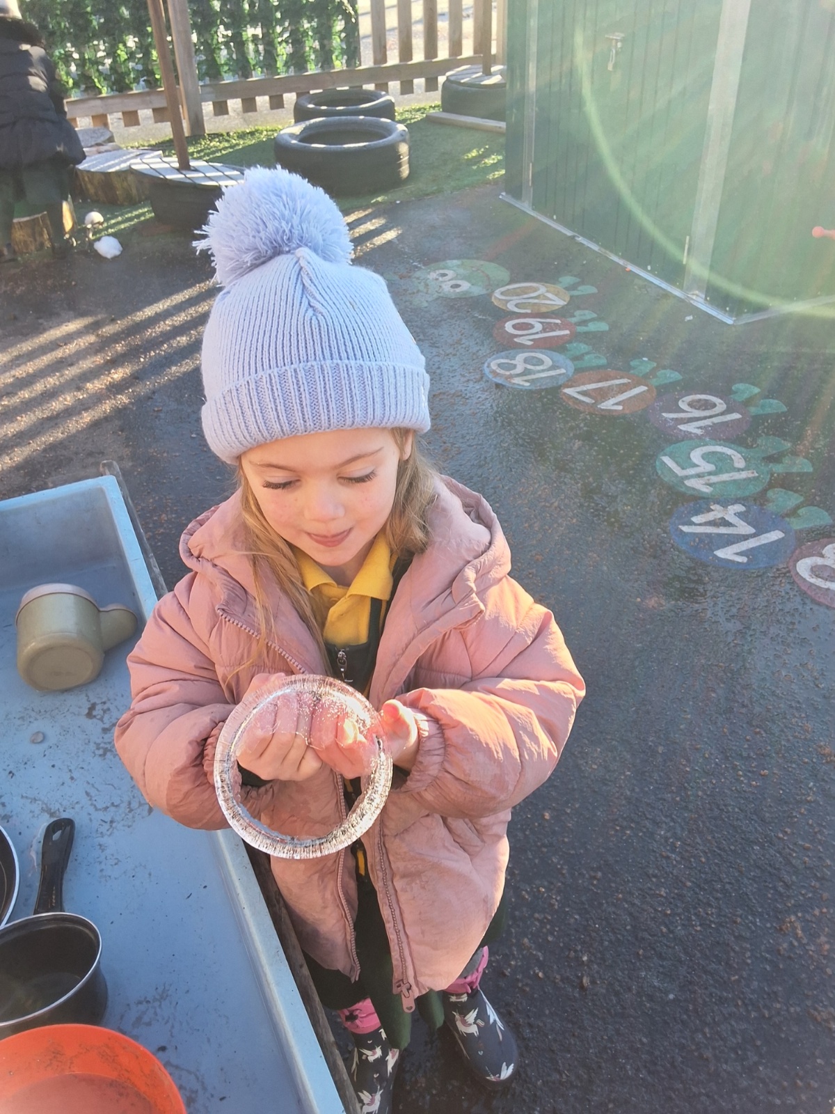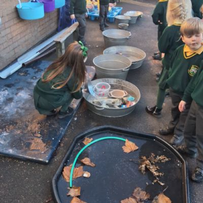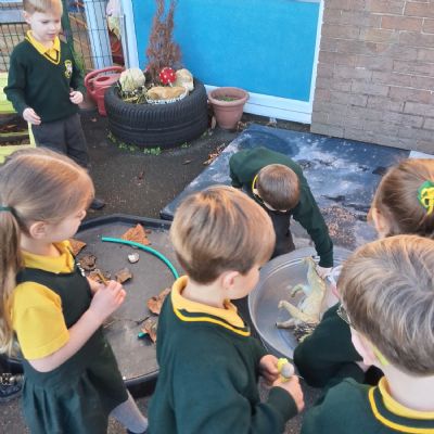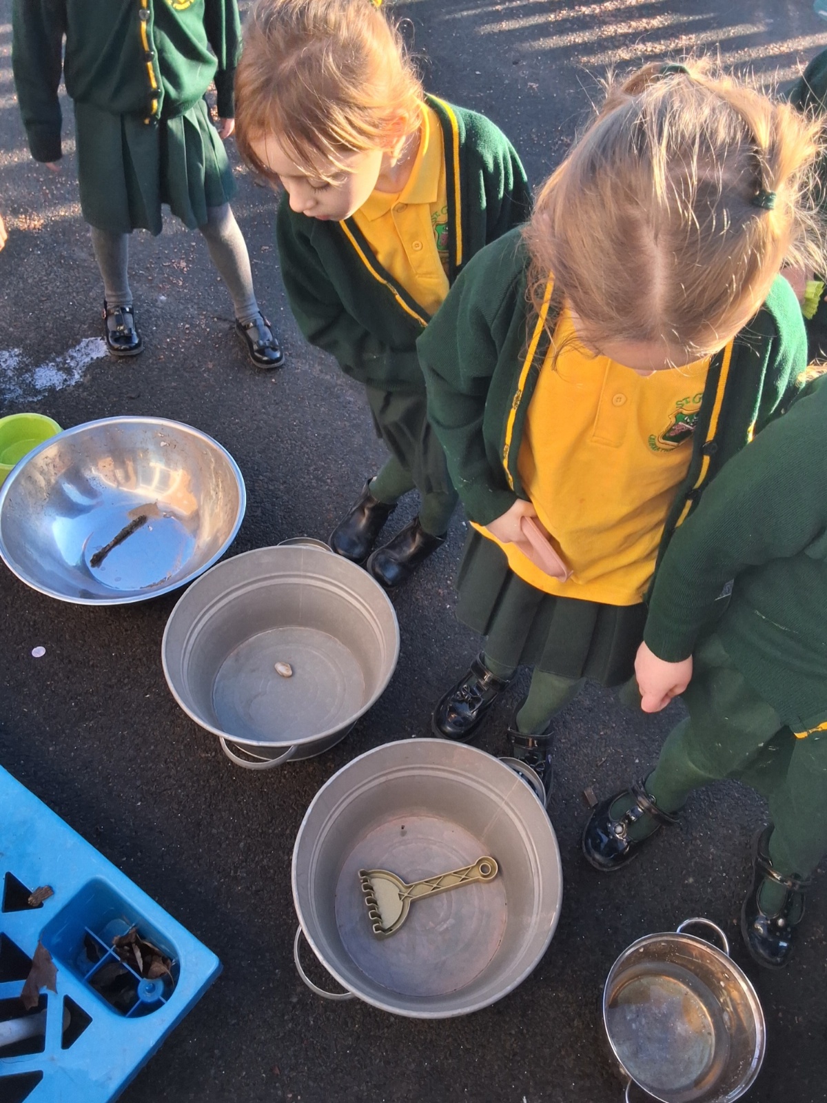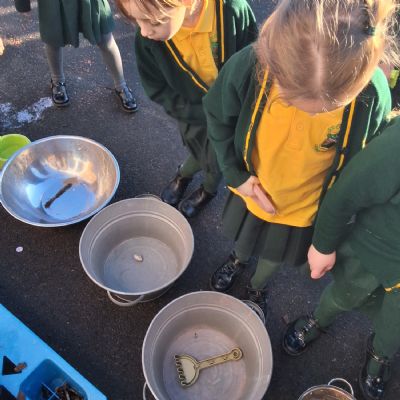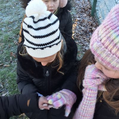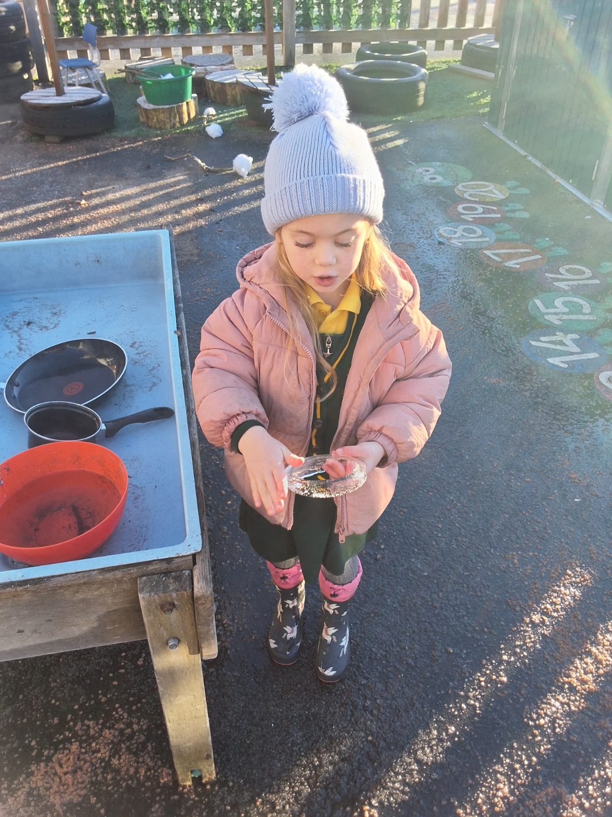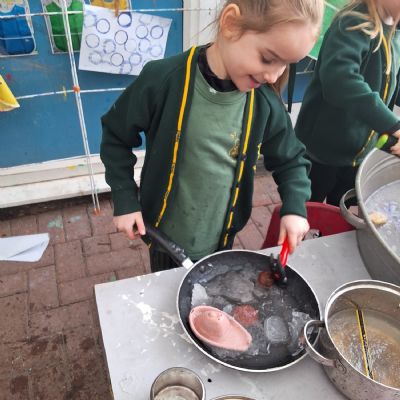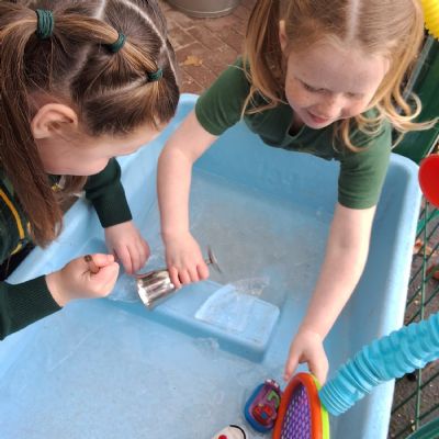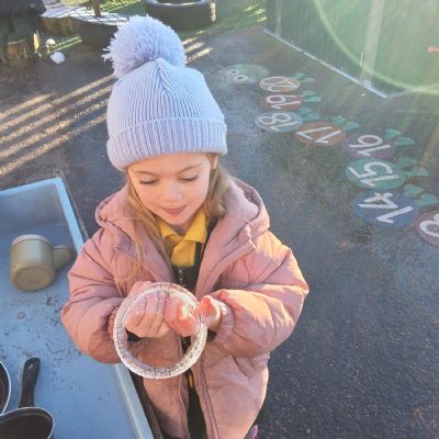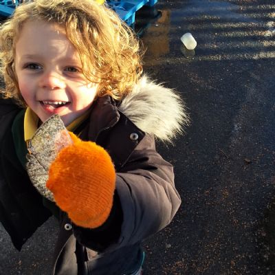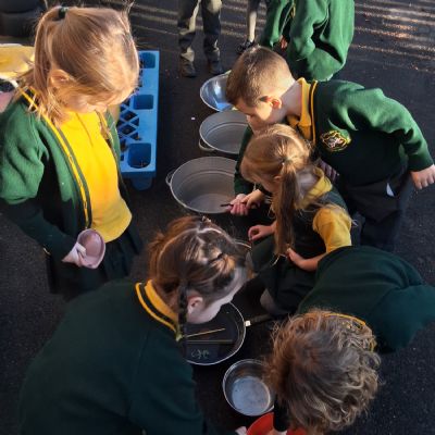 It was very cold when we returned in January. There was a lot of ice and Mr Jones had put grit/salt on our playground so we explored our grounds. We decided to freeze objects by leaving them outside in water overnight. When we arrived at school the following morning, they were frozen! We had to find ways to get the objects out of the ice.