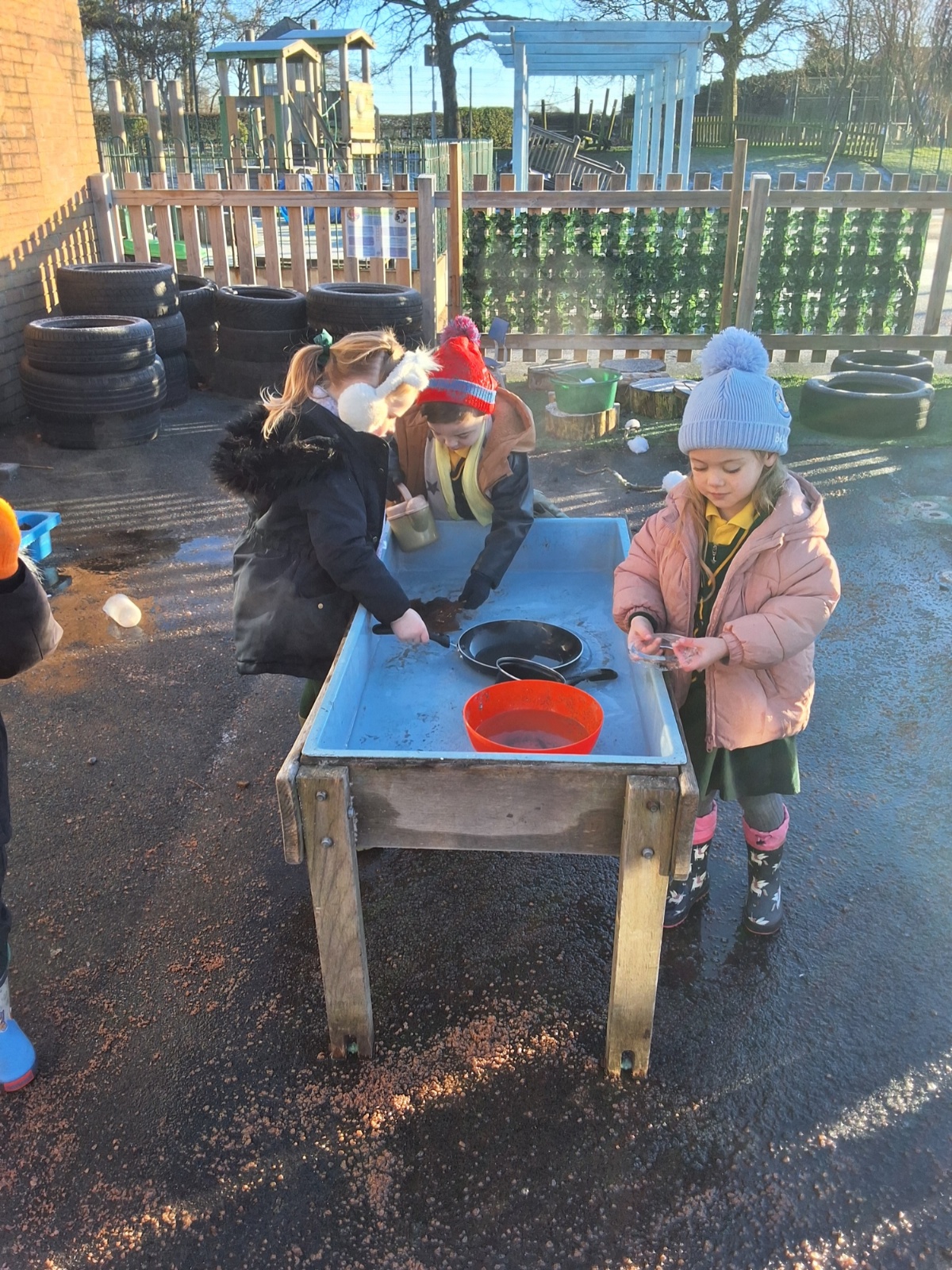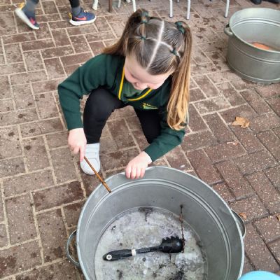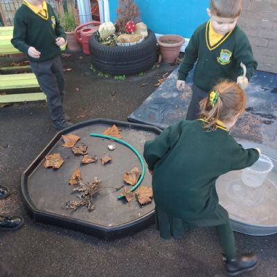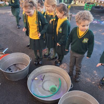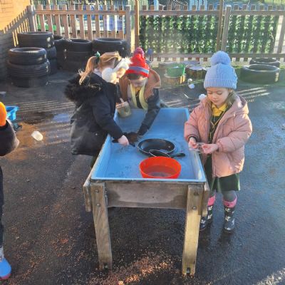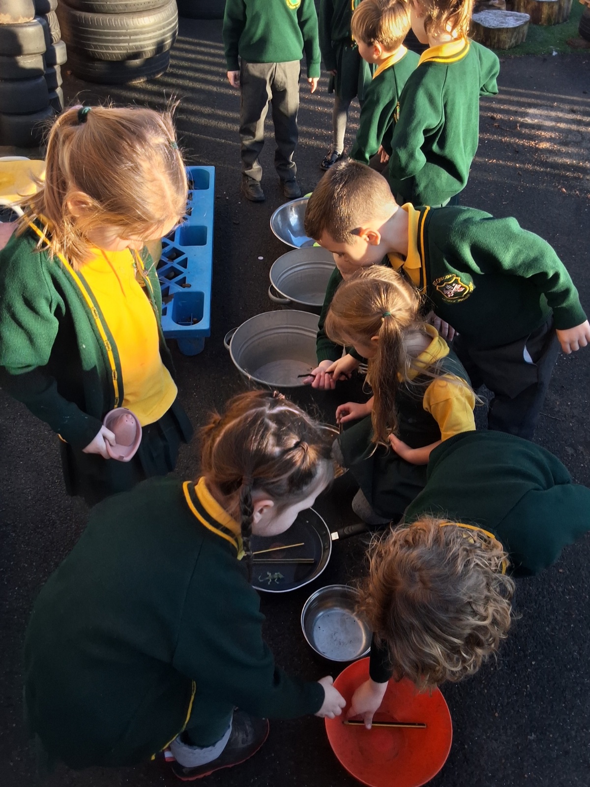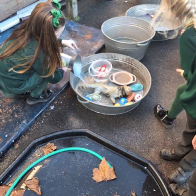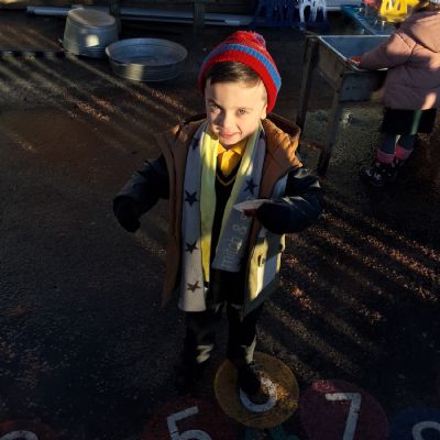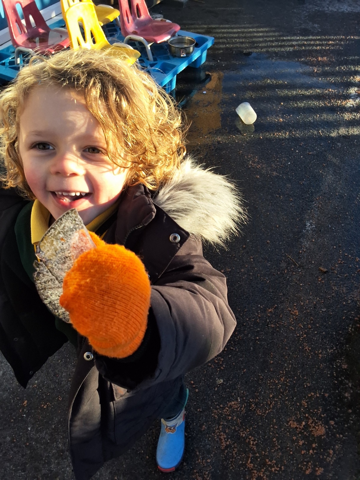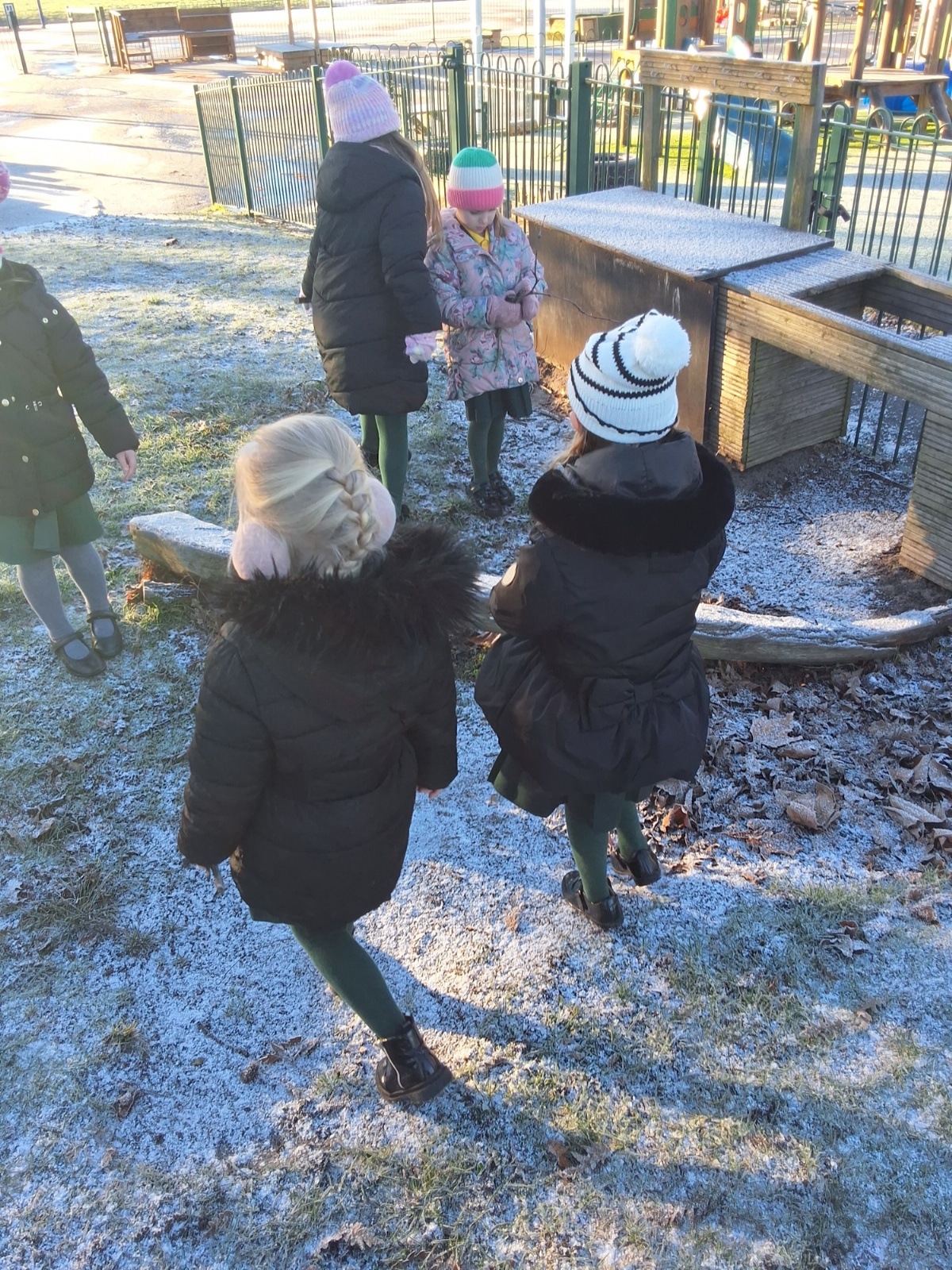 It was very cold when we returned in January. There was a lot of ice and Mr Jones had put grit/salt on our playground so we explored our grounds. We decided to freeze objects by leaving them outside in water overnight. When we arrived at school the following morning, they were frozen! We had to find ways to get the objects out of the ice.