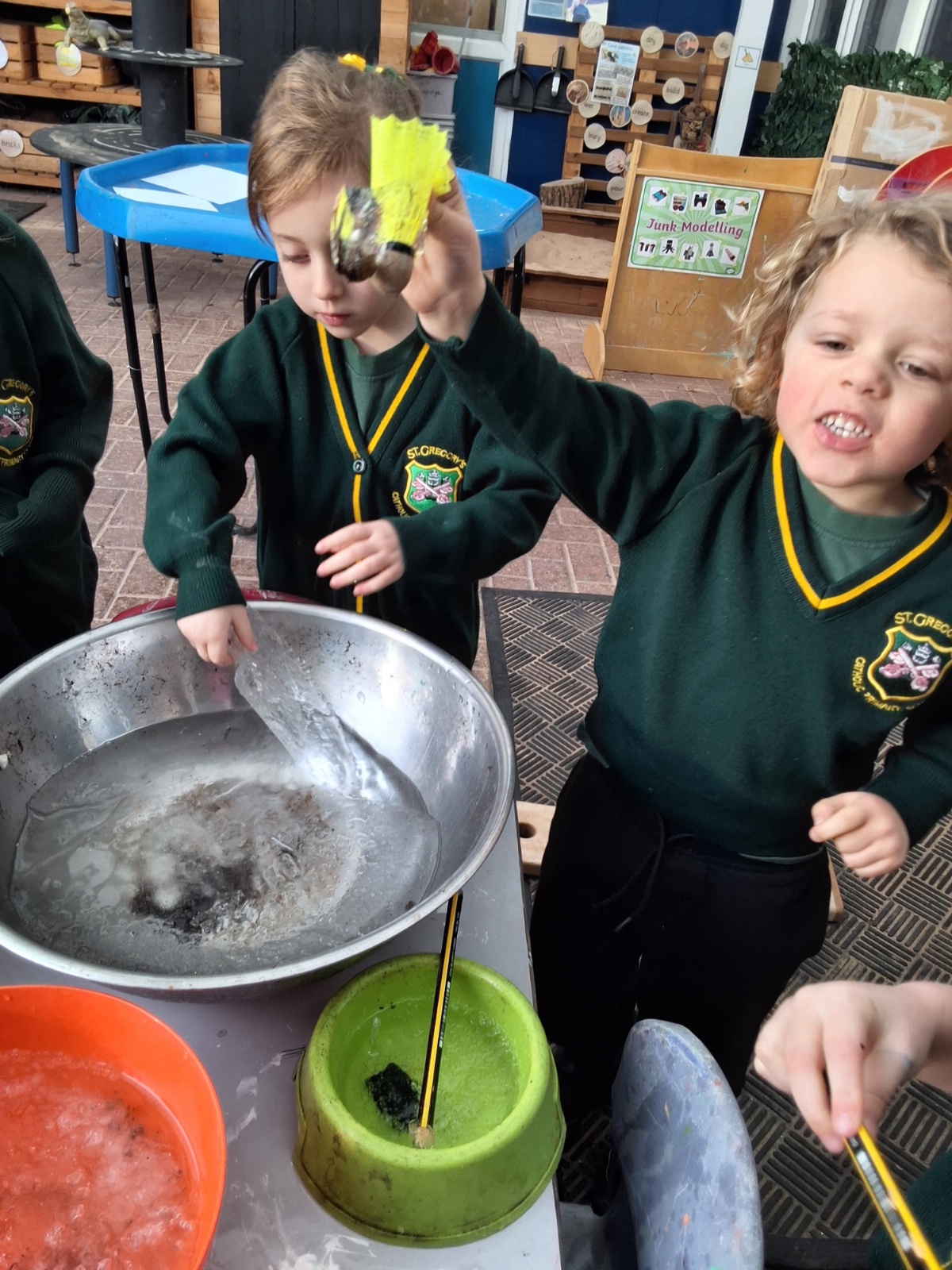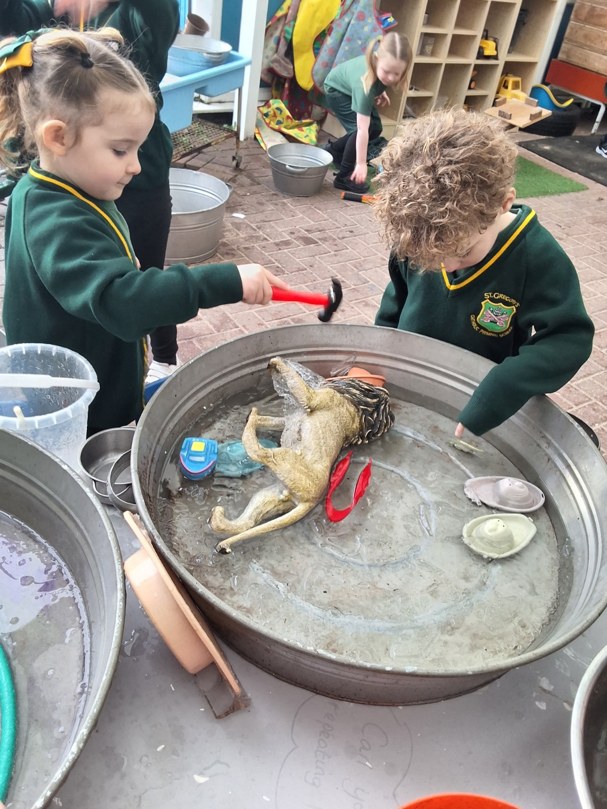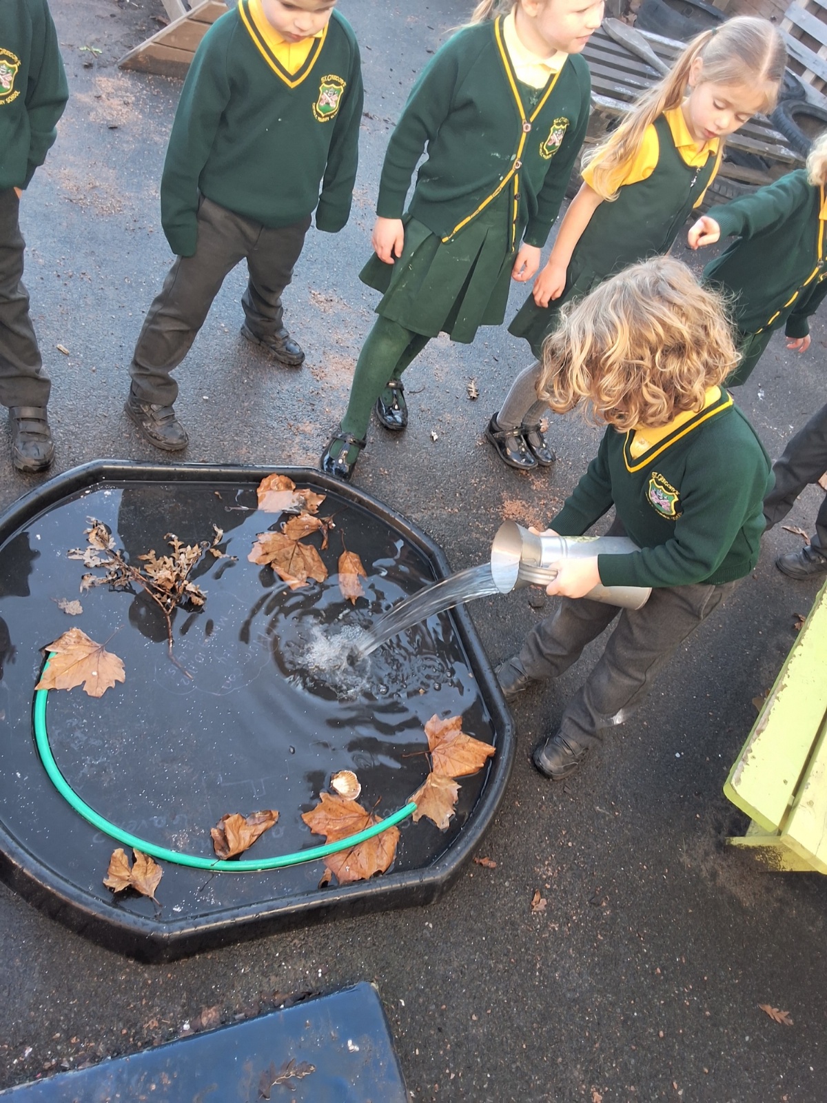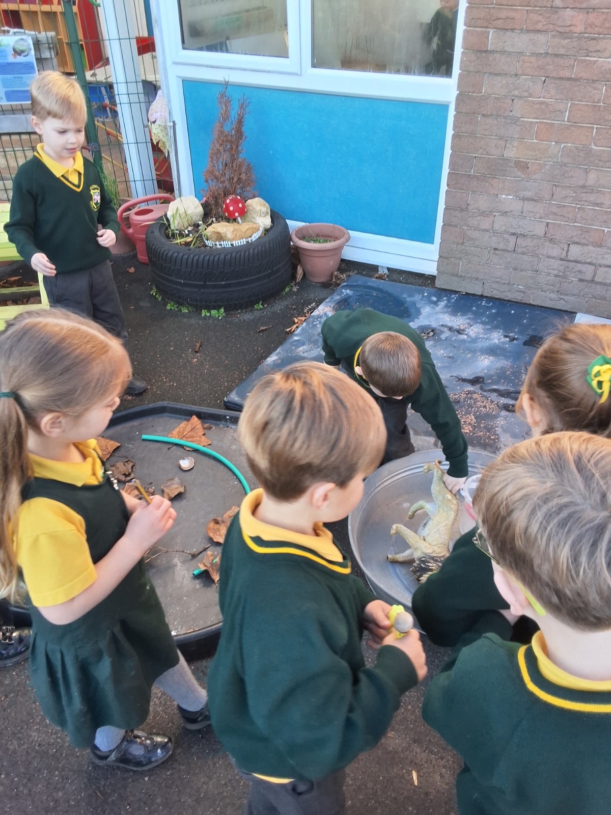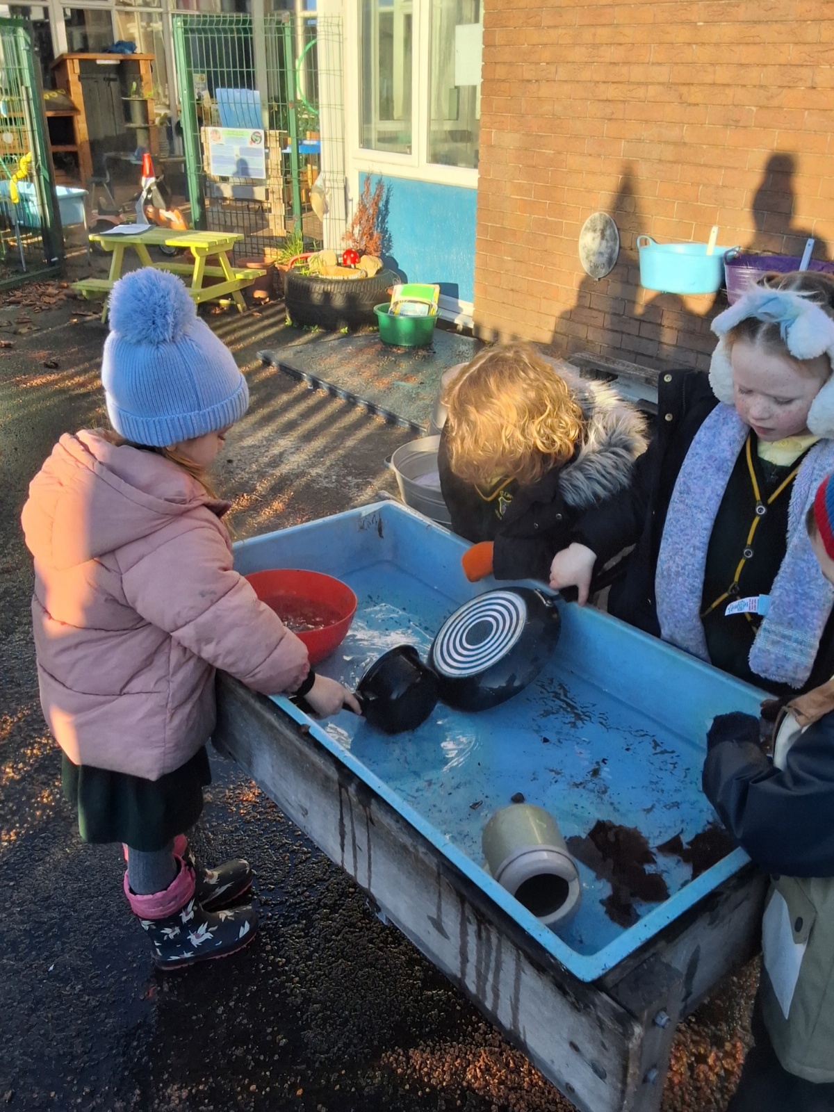 It was very cold when we returned in January. There was a lot of ice and Mr Jones had put grit/salt on our playground so we explored our grounds. We decided to freeze objects by leaving them outside in water overnight. When we arrived at school the following morning, they were frozen! We had to find ways to get the objects out of the ice.