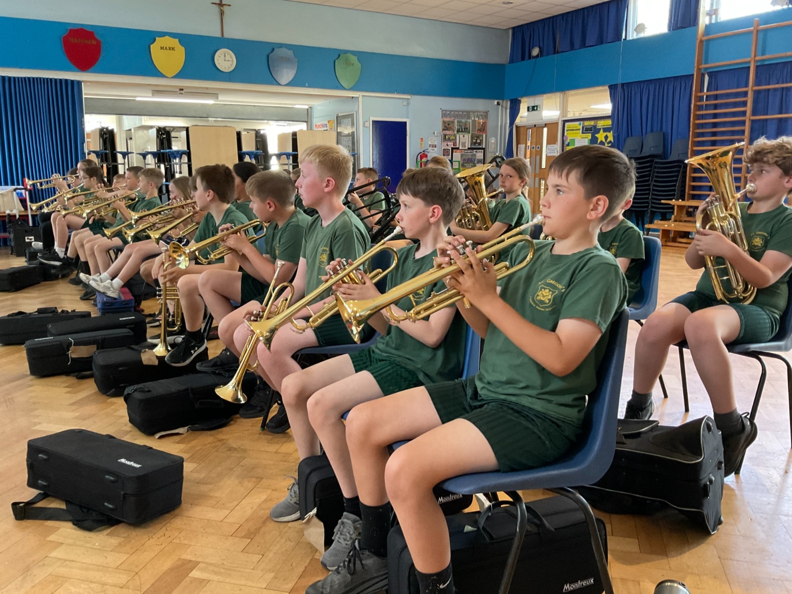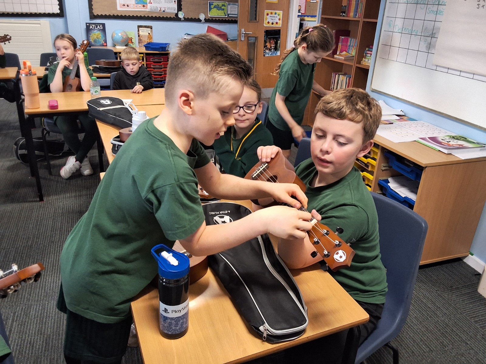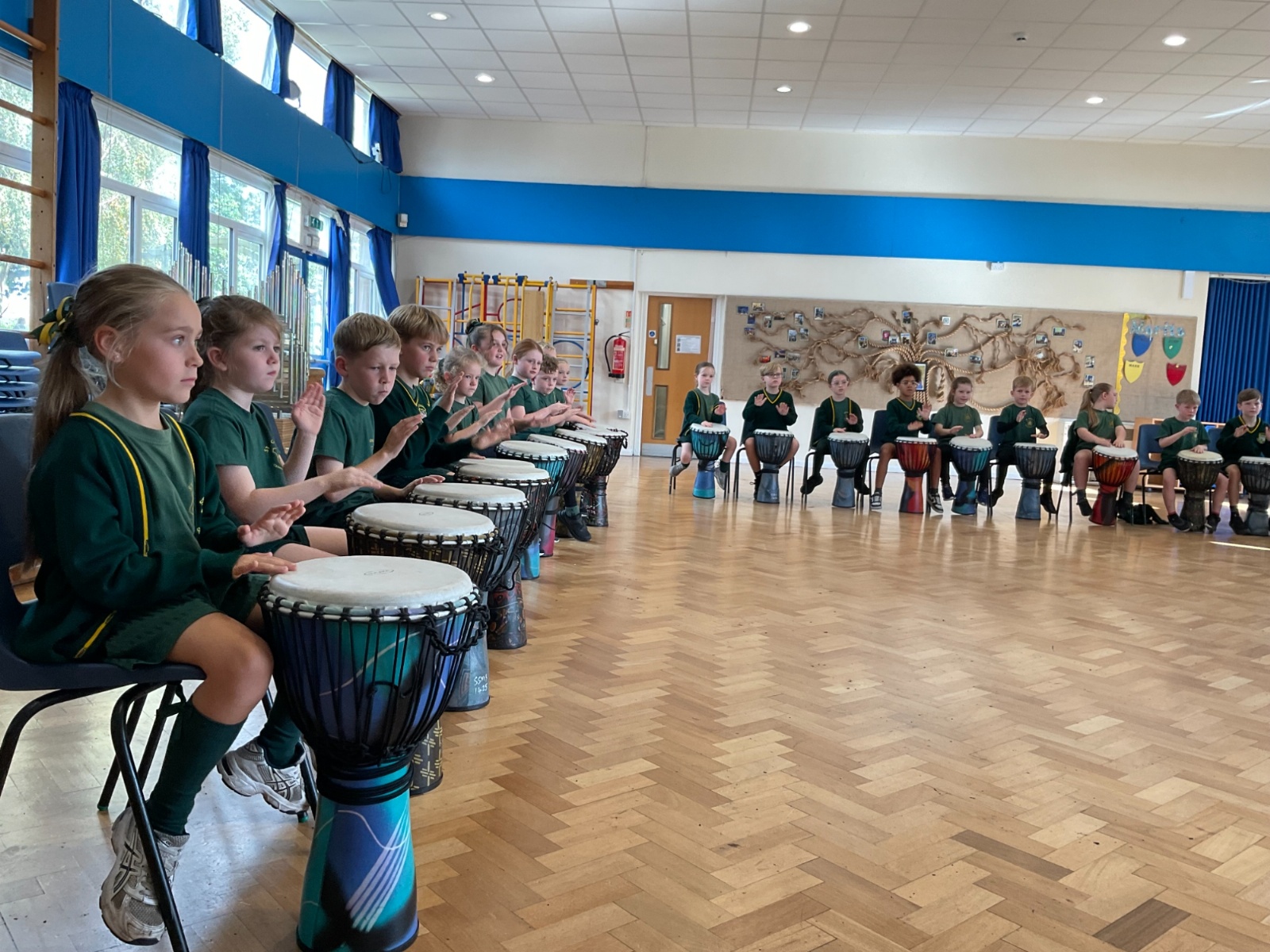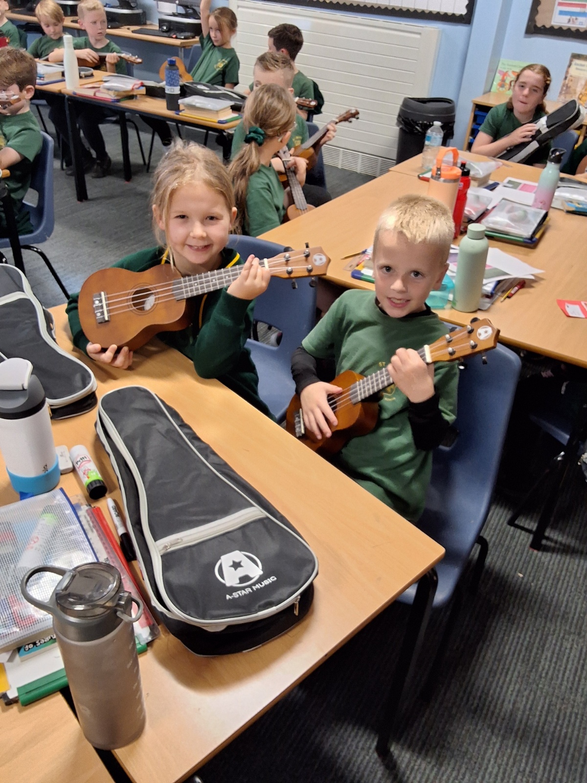 From Year 3 onwards, all children access high-quality, specialist-led instrumental tuition. This begins with djembe in Year 3, developing a strong sense of pulse, ensemble awareness, and rhythm through collective drumming. In Year 4, children learn the ukulele, focusing on melody, pitch, harmony, and reading simple musical notation. This progression culminates in a two-year programme of brass across Upper Key Stage 2, delivered by peripatetic specialists, enabling children to apply their musical understanding to a more complex instrument and perform as part of an ensemble. Through this carefully sequenced pathway, children gain experience of diverse instrumental families and styles, grounding their musical knowledge in practical experience.