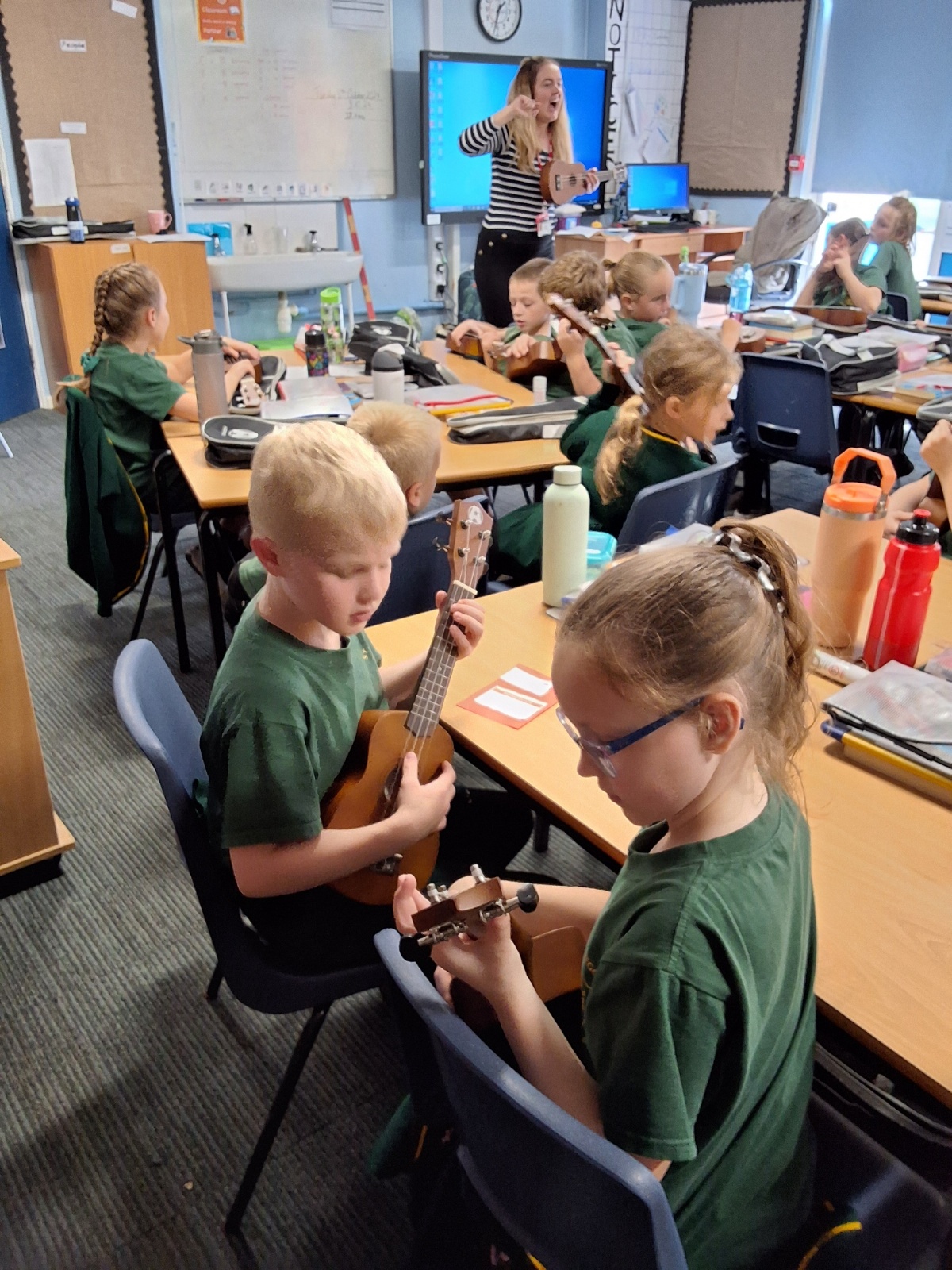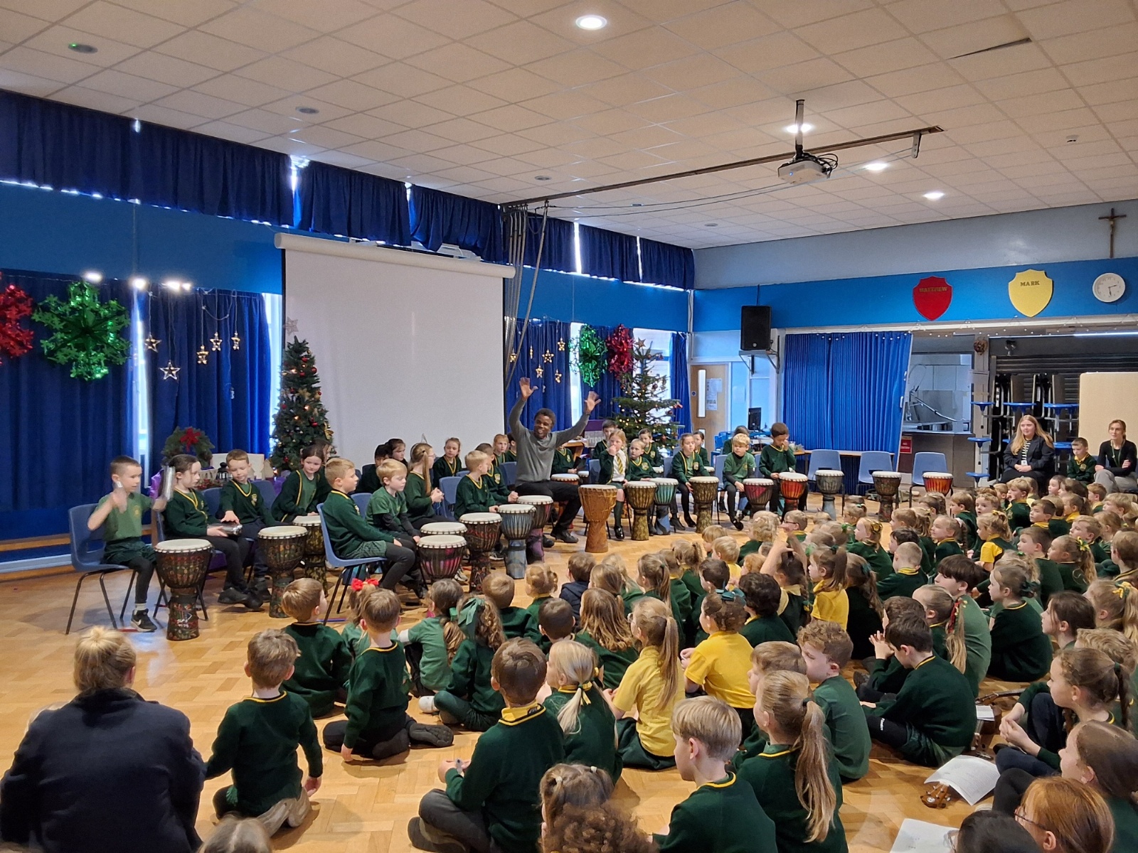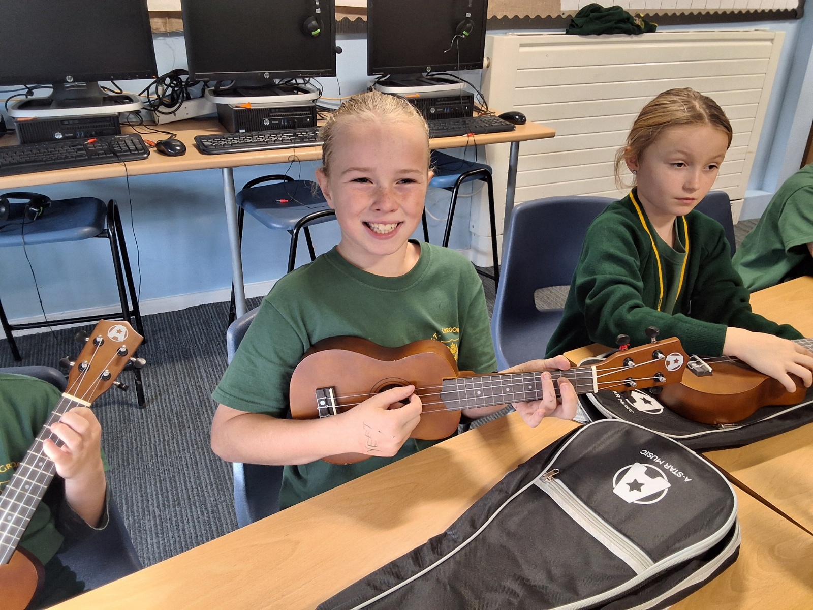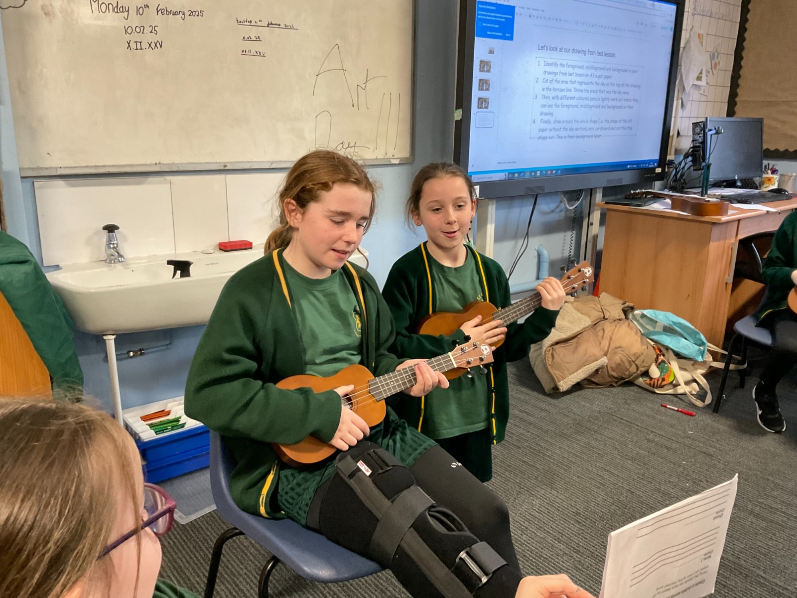 From Year 3 onwards, all children access high-quality, specialist-led instrumental tuition. This begins with djembe in Year 3, developing a strong sense of pulse, ensemble awareness, and rhythm through collective drumming. In Year 4, children learn the ukulele, focusing on melody, pitch, harmony, and reading simple musical notation. This progression culminates in a two-year programme of brass across Upper Key Stage 2, delivered by peripatetic specialists, enabling children to apply their musical understanding to a more complex instrument and perform as part of an ensemble. Through this carefully sequenced pathway, children gain experience of diverse instrumental families and styles, grounding their musical knowledge in practical experience.