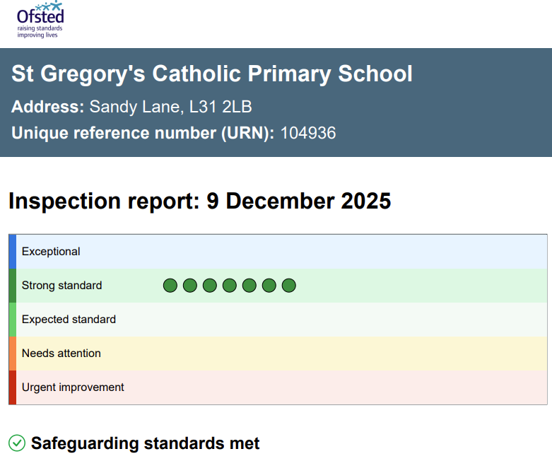 We are delighted to share the outcome of our recent OFSTED inspection, in which St Gregory’s Catholic Primary School was judged to have achieved the Strong Standard in all seven inspection areas – a highly commendable achievement – with safeguarding fully met. This is a tremendous outcome for our whole community and reflects the high expectations, ambition and care that underpin all we do. The report celebrates our welcoming and nurturing ethos, the exemplary behaviour and attitudes of our pupils, their consistently strong academic outcomes, and the strength of our Early Years provision. It recognises our coherently sequenced, research-informed curriculum, the expertise and dedication of our staff, and the positive partnerships we share with families and governors. Most importantly, it affirms that our children are flourishing—ready for the next stage of their education and life beyond. We invite you to read the full report and accompanying letter below.